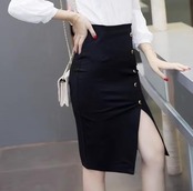 ハイウエストで脚長効果抜群、サイドスリットがエレガントさをプラス。