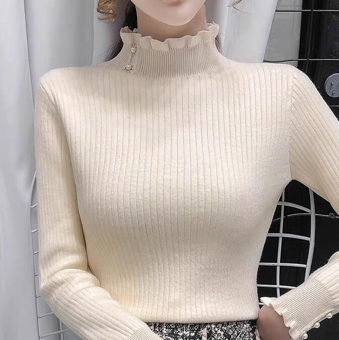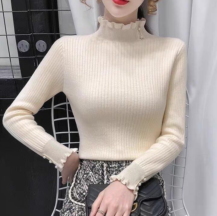 裏起毛で暖かいフリル袖のハイネックニットセーター。