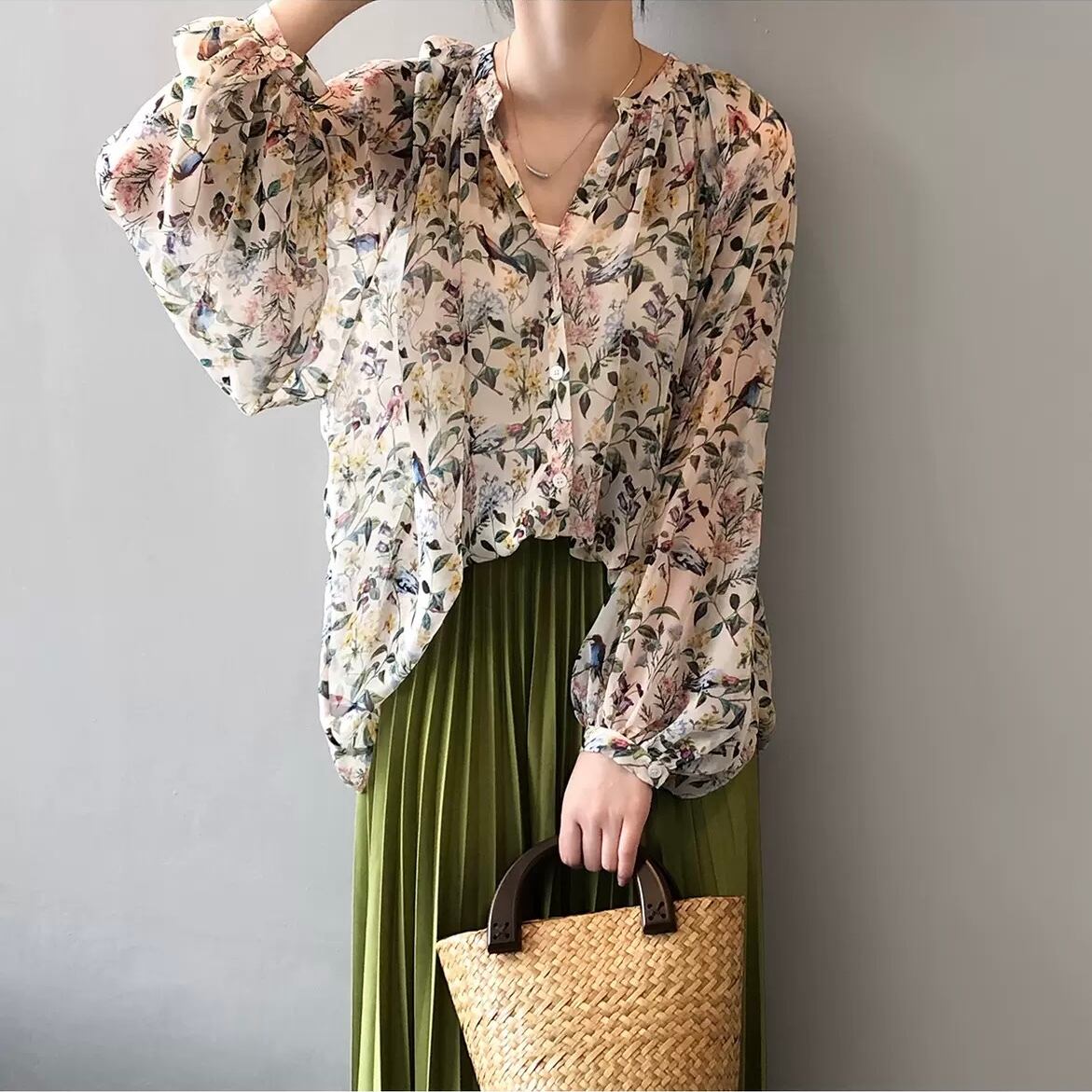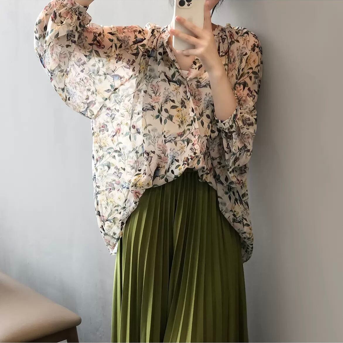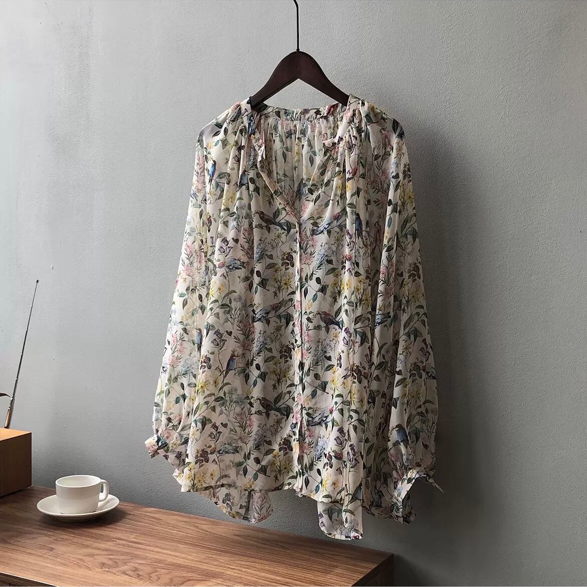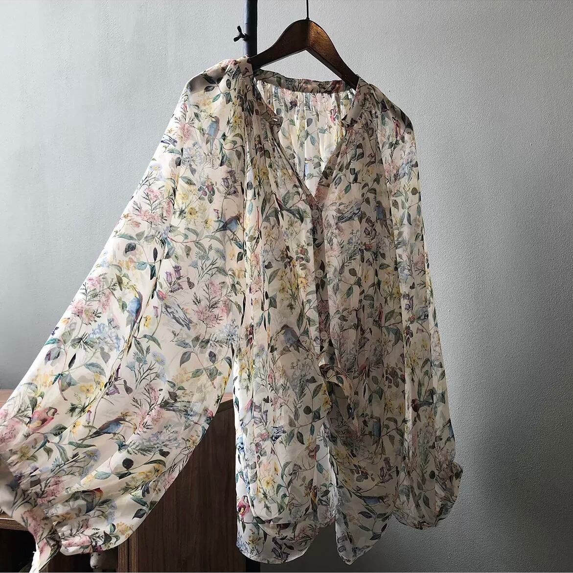 トップス 韓国風 トレンド オルチャン シャツ ブラウス とろみシャツ シャツ スキッパー ノーカラー パフスリーブ ボリューム袖 透け感 シースルー 抜き襟 袖あり 長袖 Vネック デコルテ ストレート Iライン 大人可愛い きれいめ シンプル カジュアル 大人 上品 おしゃれ お洒落 かっこいい 大人女子 こなれ感 クール モード系 セクシー モダン スタイリッシュ シック 花柄 花 フラワー 鳥 春 夏 秋 韓国系 モテ 定番 M L サイズ展開 大きいサイズ 大きい くすみカラー 大人カラー