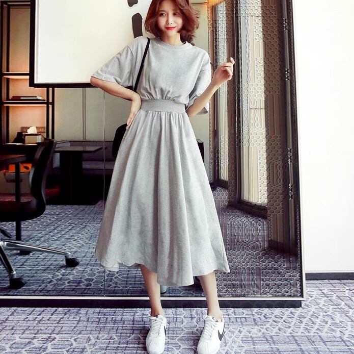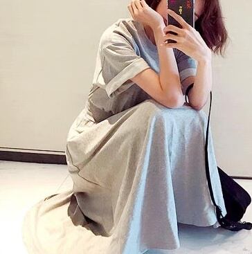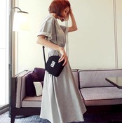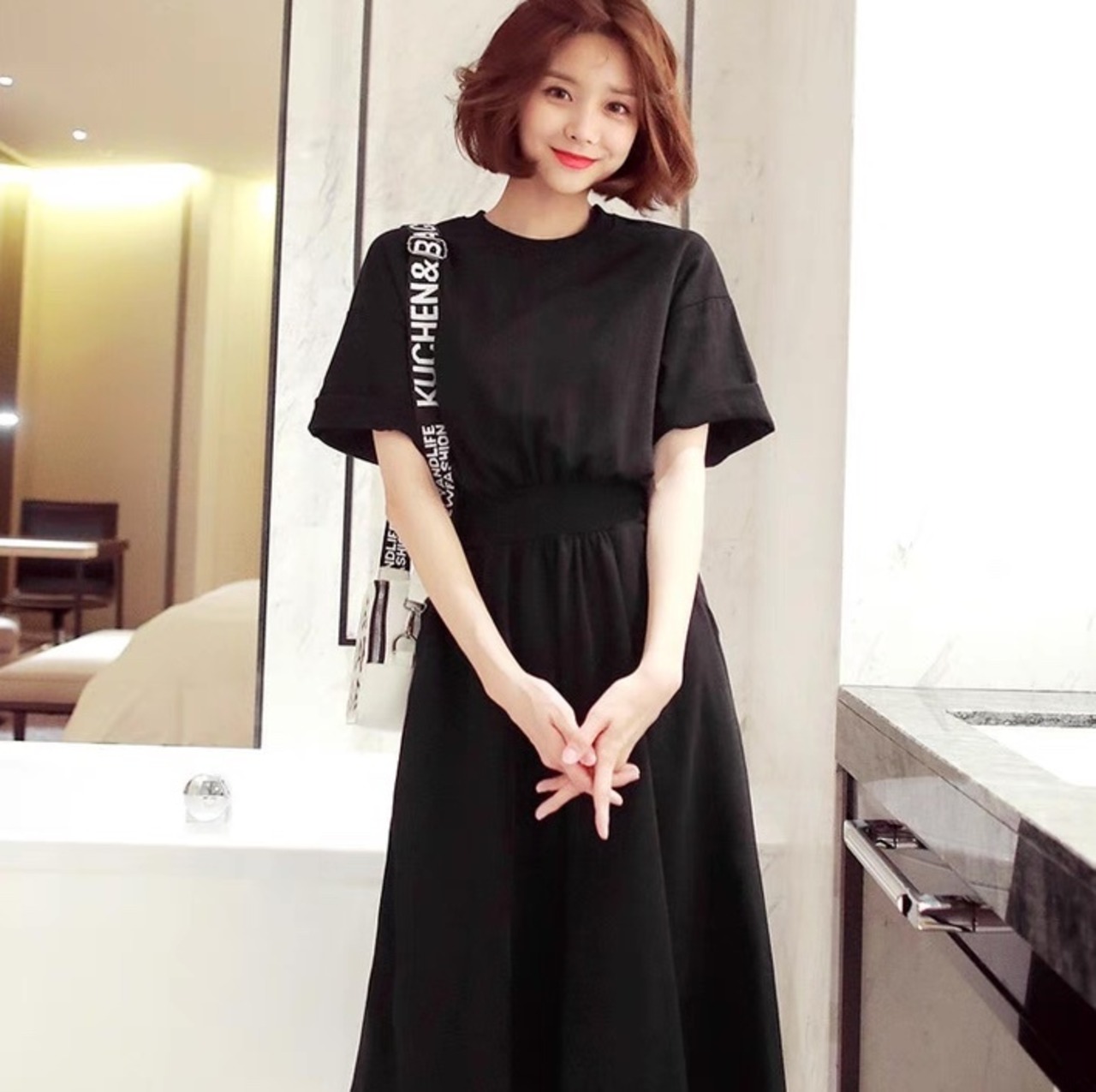 ウエストマークとポケット付きの半袖Tシャツワンピースで、美脚と体型カバーが叶うロングフレアデザイン。