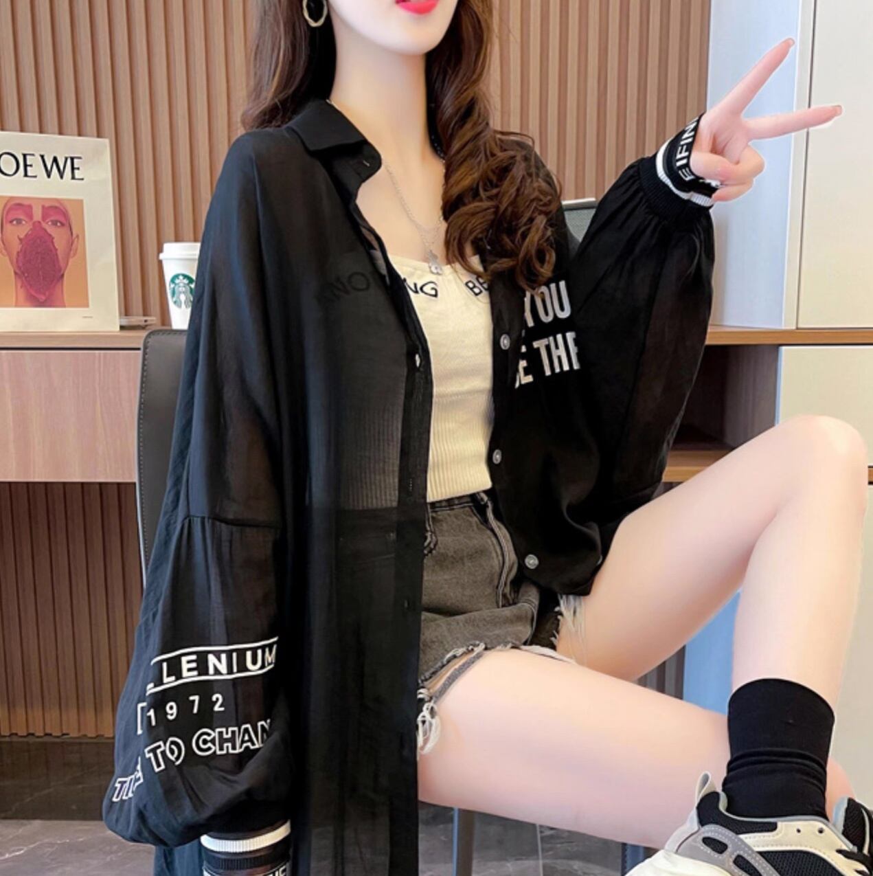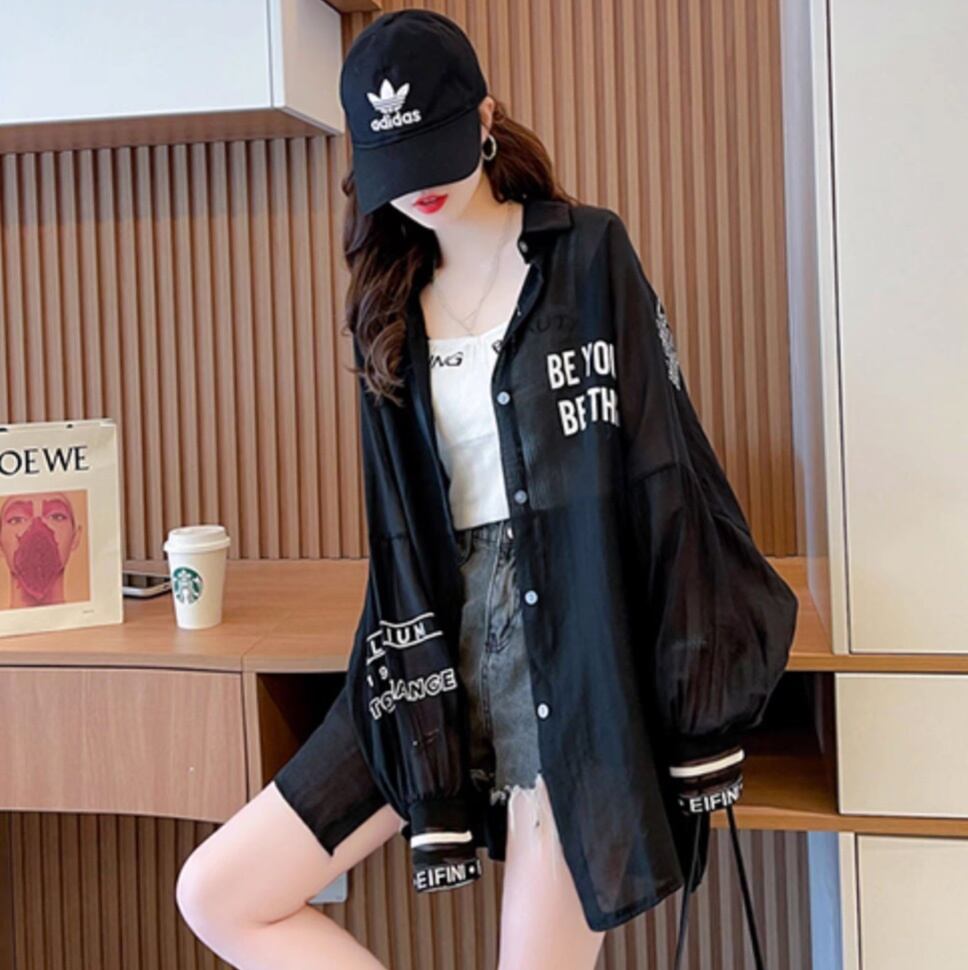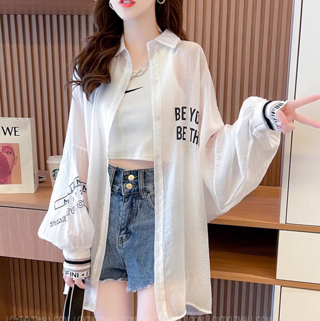 レディース シャツ ブラウス ロング 長袖 ボリューム袖 Vネック 襟付き 角襟 ストリート 透け感 シースルー かわいい 大人可愛い カジュアル こなれ感 ラフ メンズライク マニッシュ ガーリー ルーズ カレッジ風 学生風 アメリカン プレッピー アクティブ ロゴ 春 夏 秋 学生 学校 通学 部活 休日 コンサート ライブ フェス モノトーン お揃い 双子 コーデ 体型カバー 普段使い 着回し トレンド 流行 インスタ映え M L XL 2XL ビッグ ゆったり ゆる 白 ホワイト 黒 ブラック