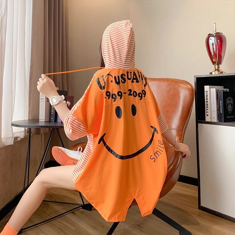 背中の大きなニッコリマークがポップで特徴的な、フレアラインのフード付きシャツの登場です。