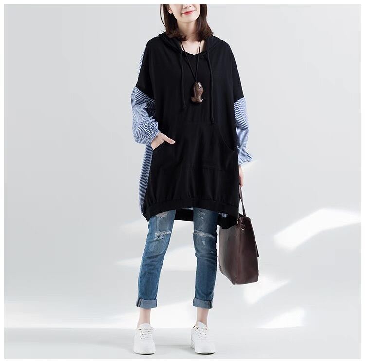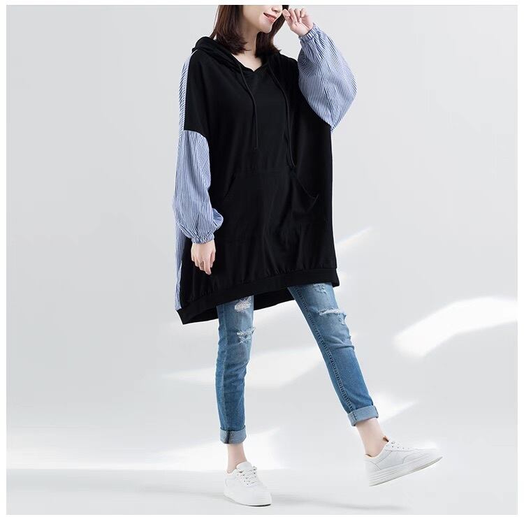 レディース トップス プルオーバー パーカー ロング 長袖 ボリューム袖 Vネック フード アシンメトリー オーバーサイズ ストリート ヴィンテージ アメカジ 切り替えデザイン 配色 ドッキング 異素材ミックス かわいい 大人可愛い カジュアル おしゃれ こなれ感 ラフ メンズライク マニッシュ ボーイッシュ ガーリー ルーズ 個性的 クール 存在感 ラブリー キュート アメリカン アクティブ 無地 ストライプ 春 秋 普段使い 流行 インスタ映え L XL 大きいサイズ ビッグ ゆったり 黒 ブラック