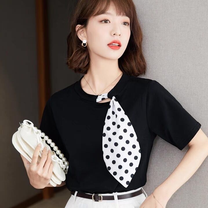 レディース トップス Tシャツ カットソー 半袖 ラウンドネック りぼんタイ フェミニン かわいい 大人可愛い カジュアル 上品 おしゃれ レトロ こなれ感 ラフ ガーリー 個性的 抜け感 ラブリー キュート クラシカル カレッジ風 学生風 ベーシック ロマンティック ドット柄 水玉 夏 デート お出かけ イベント リゾート 旅行 女子会 休日 ショッピング カフェ モノトーン 韓国 オルチャン コーデ 楽ちん 体型カバー 普段使い 着回し トレンド 流行 インスタ映え L XL 2XL 黒 ブラック