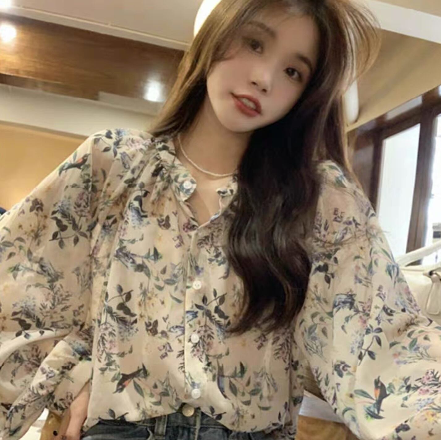 フェミニンでエレガントな長袖ボタニカル柄ブラウス。