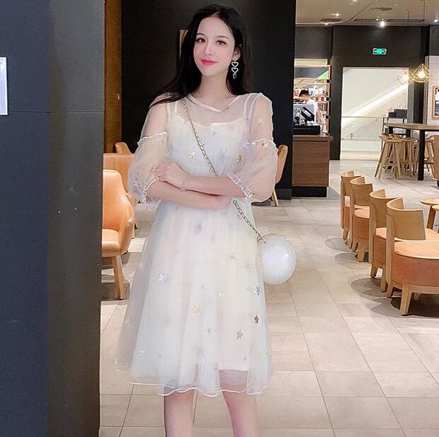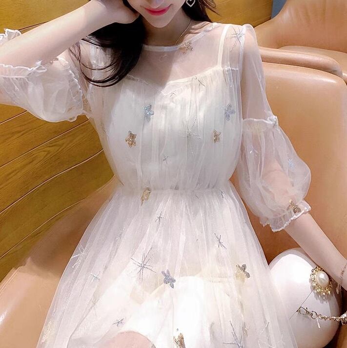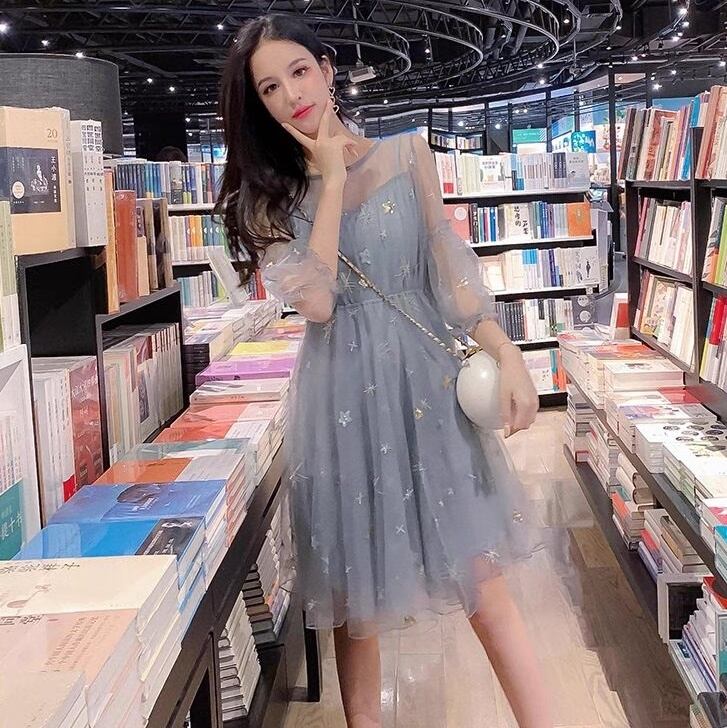 レディース ワンピース 膝丈 5分袖 ボリューム袖 ティアードスリーブ フレア Aライン フェミニン レース チュール ハイウエスト 透け感 シースルー スパンコール 切り替えデザイン チュール シアー かわいい 大人可愛い おしゃれ ルーズ 主役級 存在感 ラブリー キュート ロリータ プリンセス ラグジュアリー クラシカル ロマンティック 星柄 春 夏 デート お出かけ パーティー イベント レストラン 清楚 トレンド 流行 インスタ映え S M L クリーム グレー ゴールド シルバー キラキラ