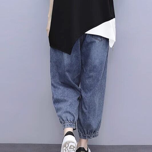 ラフで個性的なスタイルが楽しめるセットアップが登場!デニムパンツとTシャツの組み合わせは、カジュアルな着こなしを決めるのに最適です。パンツはウエストゴム仕様で楽ちんさを追求し、スポーティーな印象を与えます。トップスはラウンドネックと5分袖のアシンメトリーデザインが個性を引き立て、遊び心のあるプリントが華やかさをプラスします。