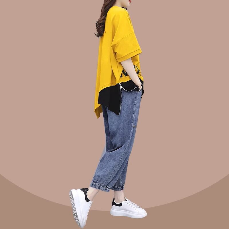 レディース トップス パンツ プルオーバー セットアップ デニムパンツ Tシャツ 8分丈 5分袖 ラウンドネック 襟なし アシンメトリー ワイド ファスナー ポケット ウエストゴム カジュアル かっこいい ラフ ボーイッシュ スポーティー 個性的 プリント 春 夏 学生 お出かけ アウトドア キャンプ イベント リゾート 旅行 公園 コンサート ライブ 楽ちん 体型カバー 普段使い 着回し L XL 2XL 3XL 大きいサイズ ビッグ ゆったり ゆる 黒 ブラック 黄色 イエロー