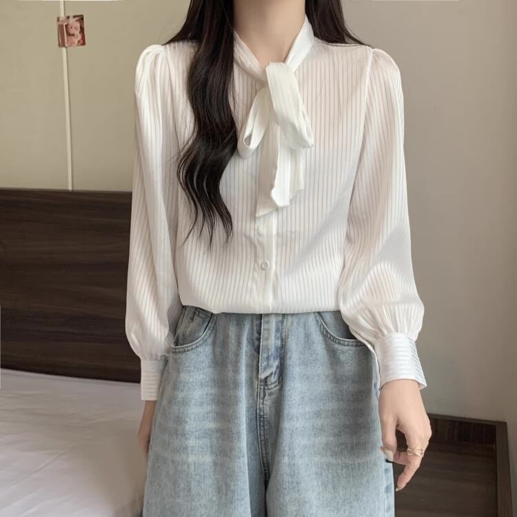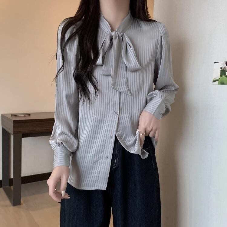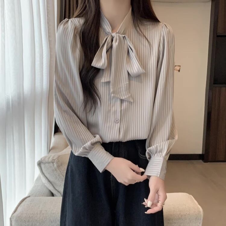 丈が長めなリボンタイ付き縦ストライプブラウスの登場です。