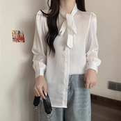 レディース トップス シャツ ブラウス 前開き ロング 長袖 ボリューム袖 パフスリーブ ラウンドネック 襟付き りぼんタイ ストレート Iライン シフォン 薄手 かわいい 大人可愛い きれいめ 上品 おしゃれ レトロ エキゾチック ガーリー 個性的 エレガント モダン フォーマル 抜け感 クラシカル ロマンティック ナチュラル ストライプ 春 秋 二次会 披露宴 会議 ミーティング プレゼン オフィス ビジネス OL 通勤 デート お出かけ パーティー レストラン 女子会 ホテル 体型カバー