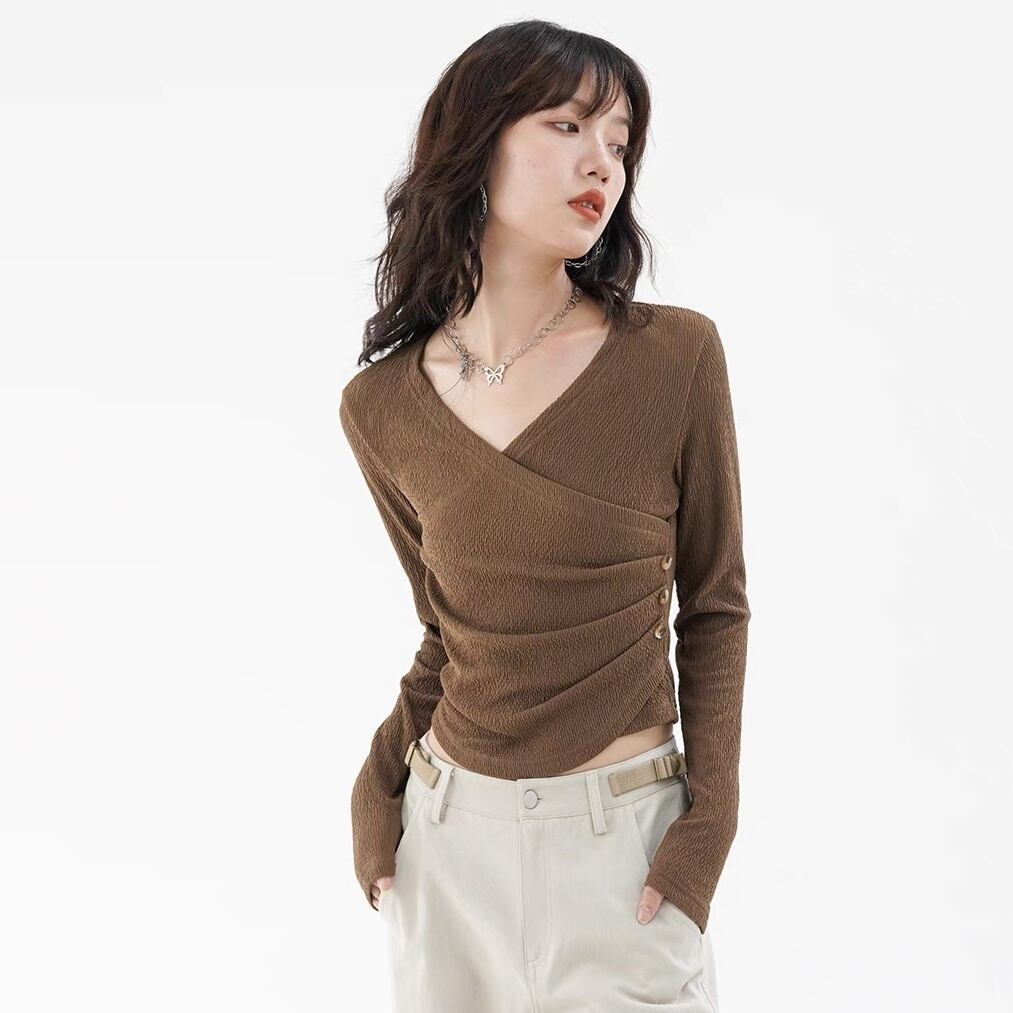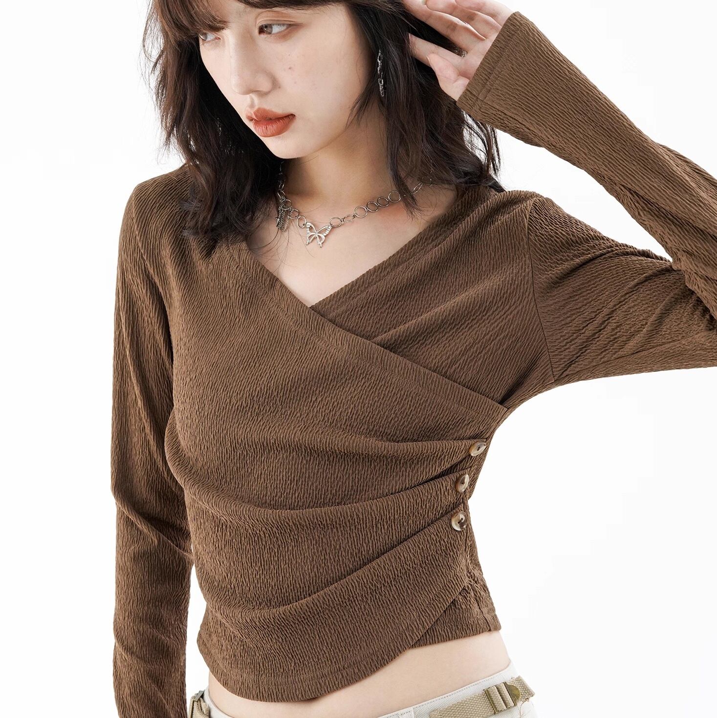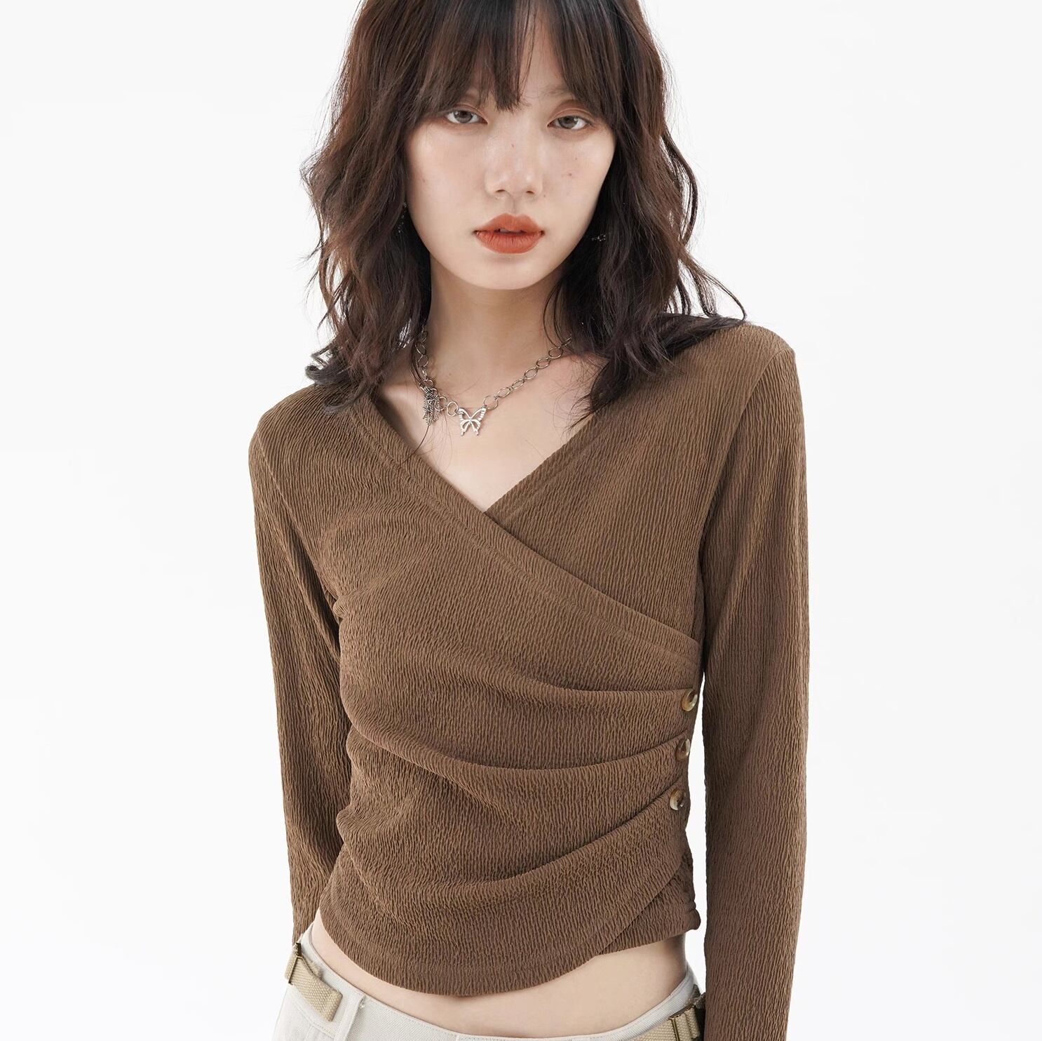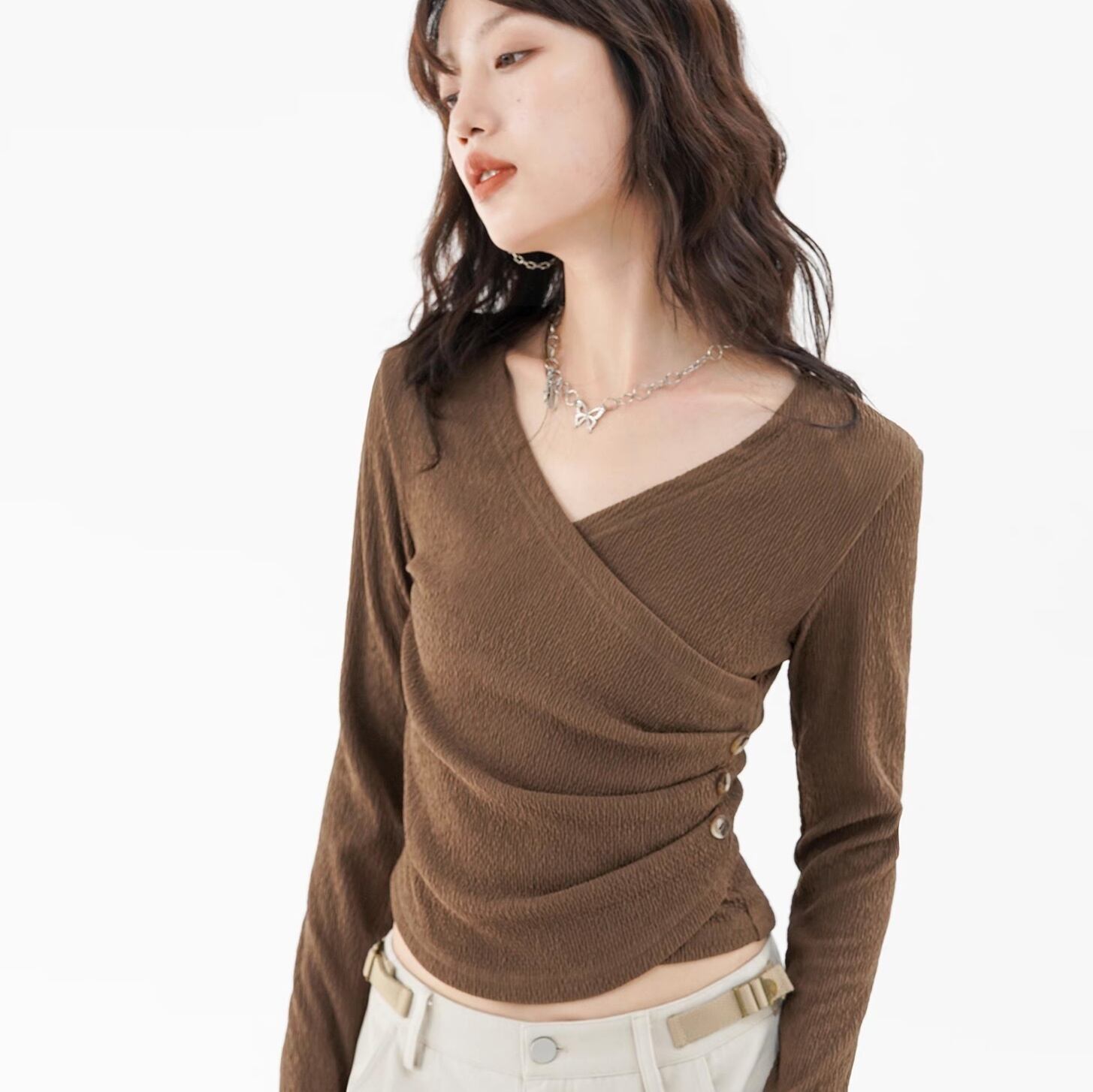 トップス カットソー 長袖 カシュクール フェミニン タック ハイウエスト ボタン ギャザー 大人可愛い きれいめ シンプル おしゃれ かっこいい レトロ こなれ感 ガーリー クール モード系 エレガント モダン 抜け感 ラブリー キュート 都会的 プレッピー アクティブ ナチュラル 無地 春 秋 デート お出かけ イベント 旅行 レストラン 女子会 休日 ライブ カフェ 韓国 オルチャン コーデ 普段使い 着回し トレンド 流行 インスタ映え 定番 S M L 小さいサイズ 大きいサイズ 茶色 ブラウン