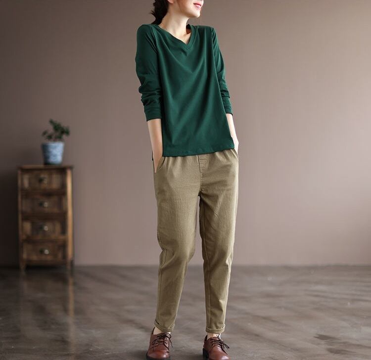 カジュアルなVネックロンTは、シンプルなデザインが特徴。薄手で軽やかな着心地で、季節を問わず幅広いシーンで活躍します。細身でスリムなシルエットが体型を綺麗に見せるだけでなく、女性らしい印象も与えてくれます。様々なコーディネートに合わせやすく、一枚持っていると便利なアイテムです。
