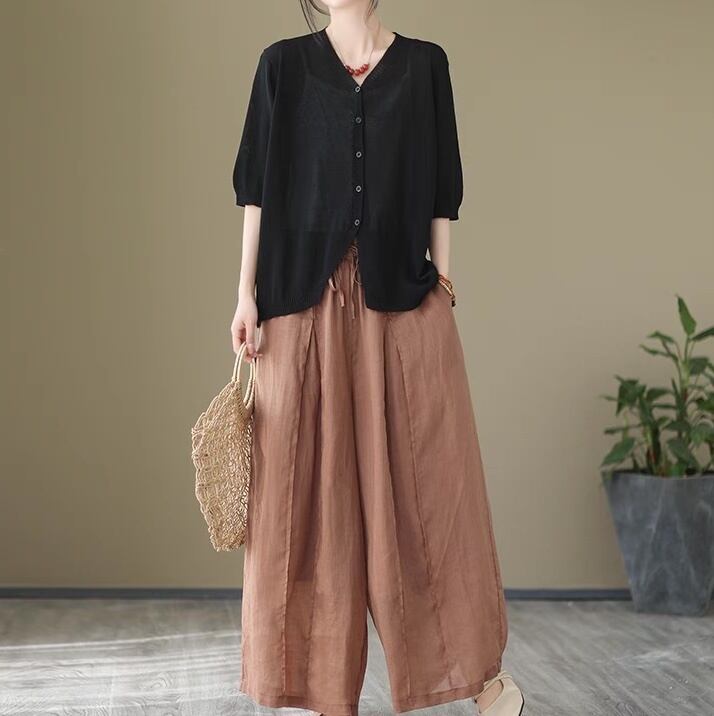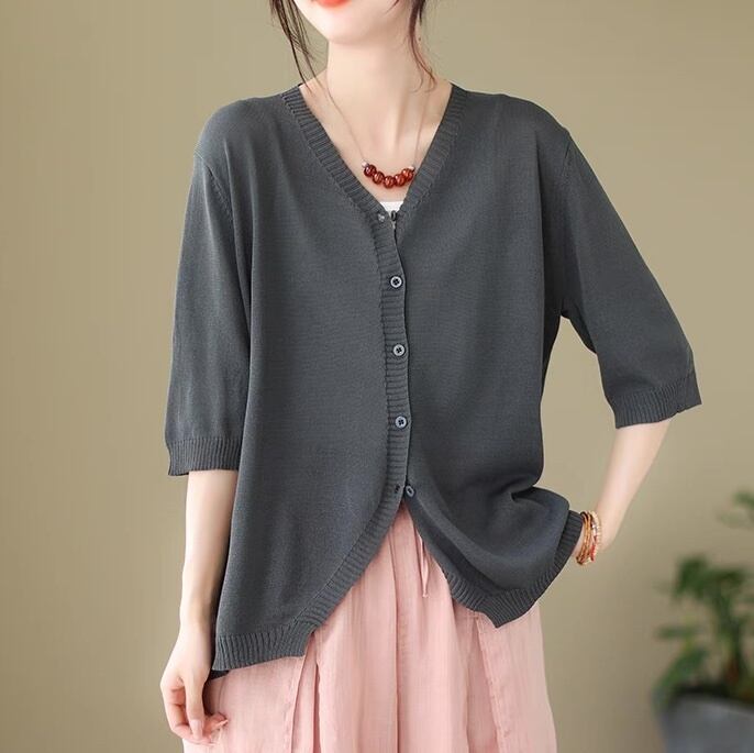 7分袖とVネックが上品で、透け感のある薄手の素材が軽やかさを演出します。