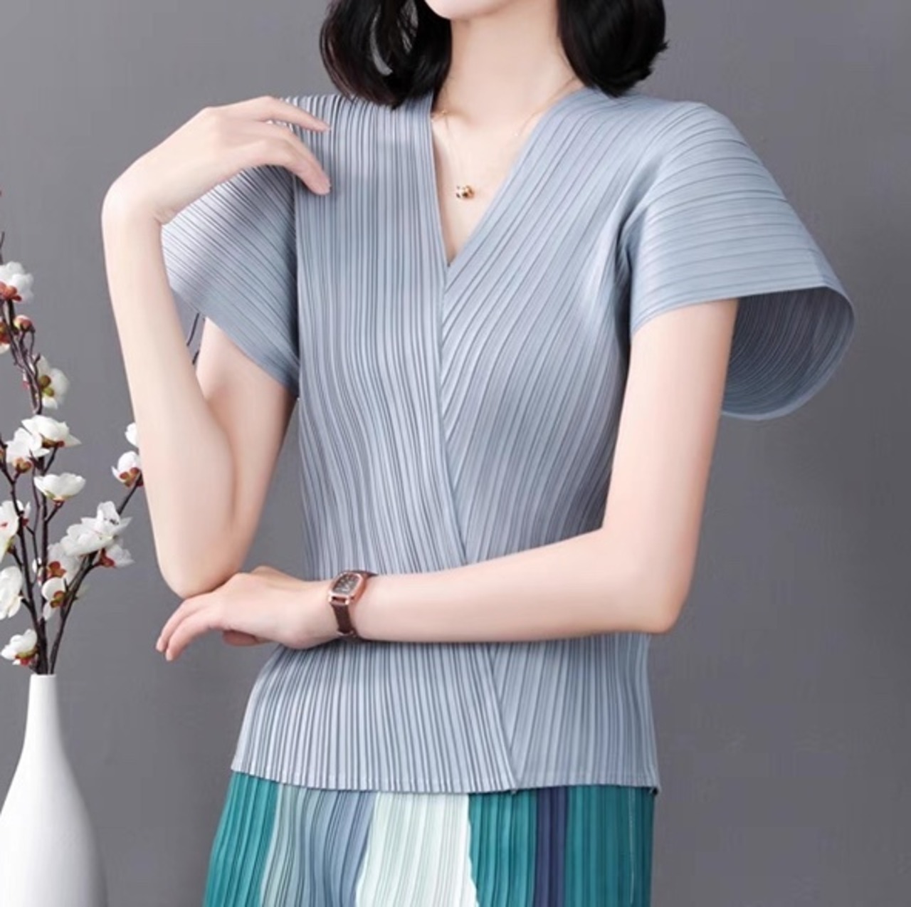 半袖とプリーツデザインが、シンプルながらも上品でこなれ感を演出します。