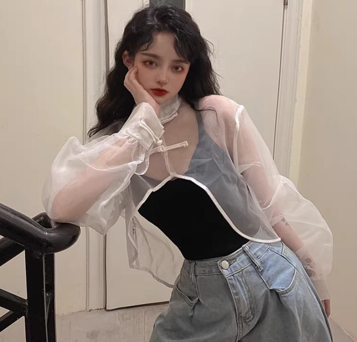 チャイナシャツ 中華 レディース トップス シャツ ブラウス ミニ ショート クロップド丈 長袖 ハイネック ワイド ストリート 2way 透け感 シースルー 異国風 薄手 チュール シアー かわいい シンプル カジュアル おしゃれ かっこいい エスニック エキゾチック ラフ ルーズ 個性的 クール モード系 ラブリー キュート ナチュラル ワイルド 無地 蝶 夏 秋 お出かけ イベント 旅行 海 ビーチ 公園 バカンス コンサート ライブ フェス 双子 韓国 オルチャン コーデ 着回し トレンド 流行