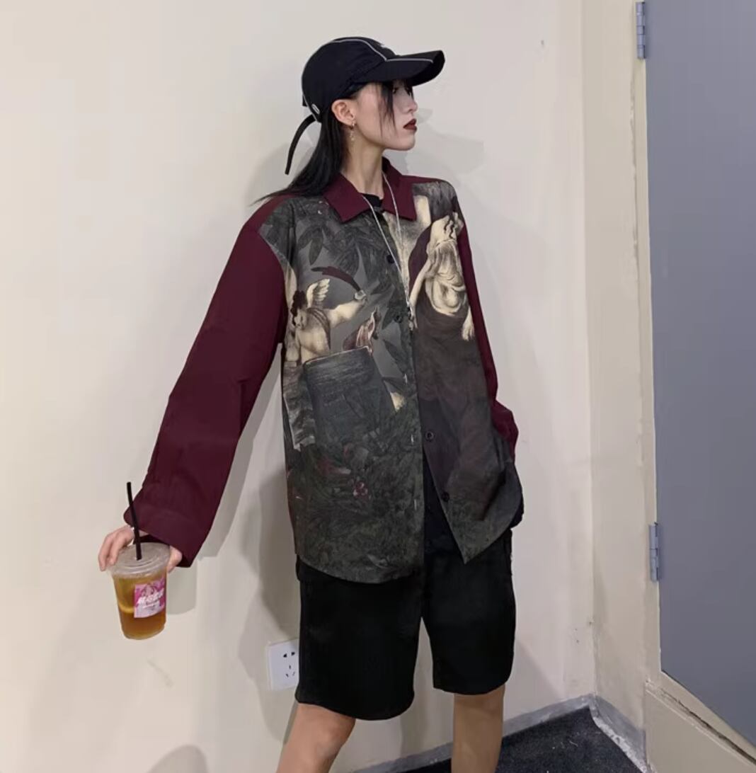 トップス シャツ ブラウス レディース 上着 前開き 長袖 襟付き ストリート 2way ヴィンテージ アメカジ 薄手 伸縮性 かわいい 大人可愛い シンプル カジュアル おしゃれ かっこいい こなれ感 ラフ メンズライク マニッシュ ボーイッシュ ルーズ クール モード系 ヴィンテージ アメリカン 総柄 天使 エンジェル 秋 冬 オールシーズン お泊まり コンサート ライブ お揃い 双子 韓国 オルチャン コーデ 楽ちん ゆったり ゆる