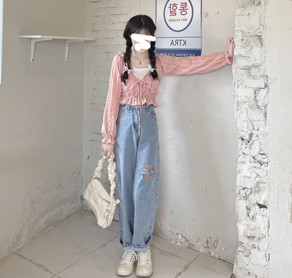 デニムパンツにハートがキュートなポイントをプラス。