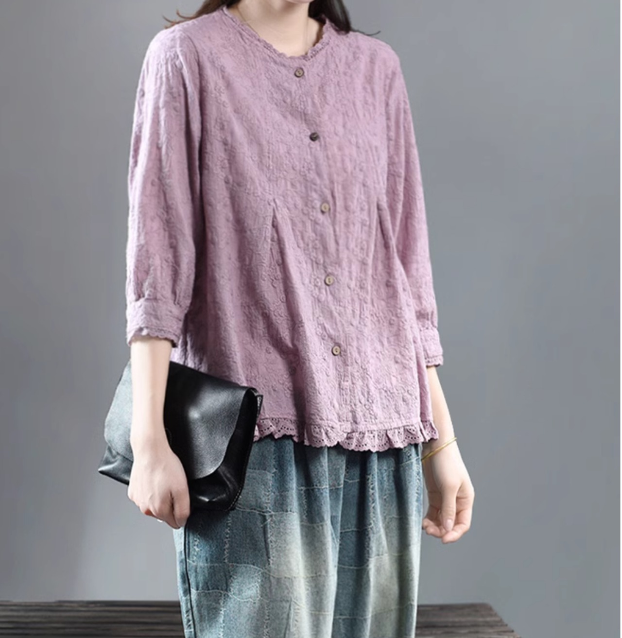 トップス シャツ ブラウス レディース 7分袖 長袖 ハイネック Iライン 前開き ボタン ヴィンテージ かわいい 大人可愛い シンプル カジュアル おしゃれ かっこいい レトロ アジアン エスニック こなれ感 ラフ ガーリー ルーズ 主役級 ラブリー キュート 花柄 春 秋 デート お出かけ イベント 旅行 海 公園 女子会 休日 ショッピング ライブ お花見 フェス お揃い 双子 韓国 コーデ 楽ちん 美脚 脚長 普段使い 着回し モテ トレンド 流行 インスタ映え 定番