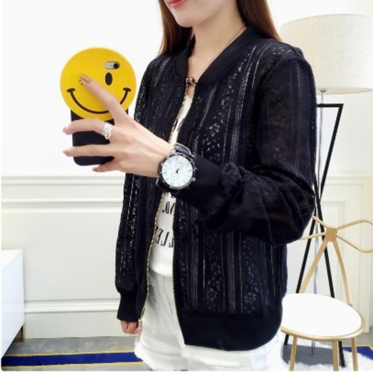 可愛らしいレースが施された大人可愛いブルゾンが登場しました。シンプルで上品なデザインながらも、レースの切り替えデザインがおしゃれなアクセントとなっています。襟なしで襟元もスッキリとしているので、首元に重さを感じさせません。長袖なので、一枚で着ても華やかな雰囲気を演出できるアイテムです。ファスナーが前開きになっているので、着脱もスムーズです。薄手の素材感で、季節を問わず活躍すること間違いなし。デートや女子会、お出かけなど多彩なシーンで着回しの効く万能ブルゾンです。是非、おしゃれを楽しむ大人女子の皆様におススメしたい一着です。