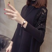 ロマンティックなクロシェ編みが彩る、ハイネックのロングニット。