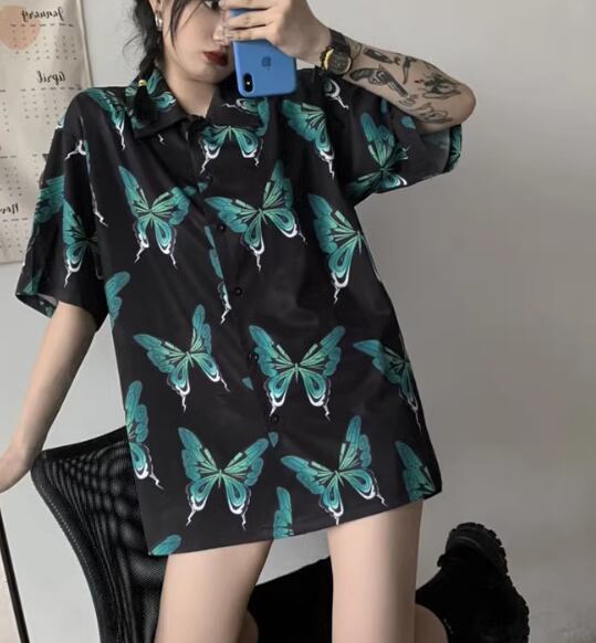 レディース トップス シャツ ブラウス 前開き ロング 半袖 5分袖 襟付き スリム 細身 ストレート フェミニン ストリート ボタン 大人可愛い きれいめ おしゃれ かっこいい レトロ ラフ ルーズ プリント 蝶 総柄 春 秋 冬 ロングシーズン 10代 20代 30代 40代 お姉さん オフィス OL 学生 デート お出かけ 重ね着 韓国 体型カバー プチプラ 普段使い 着回し モテ トレンド 流行 インスタ映え M L XL 2XL 3XL 大きいサイズ ゆる 黒 ブラック 緑 グリーン 大人カラー