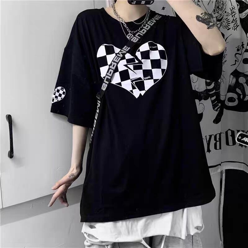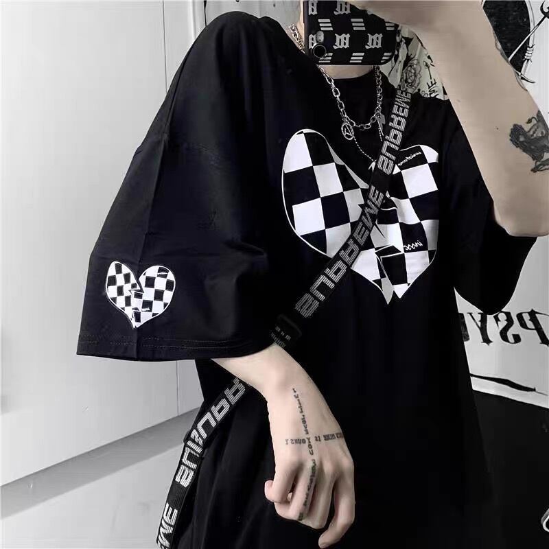 レディース トップス カットソー 半袖 ラウンドネック かわいい カジュアル おしゃれ 抜け感 ラブリー キュート ゴシック ベーシック チェック 格子柄 ギンガムチェック ハート柄 夏 10代 20代 ティーン 学生 イベント 女子会 休日 コンサート ライブ カフェ フェス 重ね着 お揃い 双子 韓国 オルチャン コーデ 楽ちん 体型カバー 普段使い 着回し レイヤード トレンド 流行 インスタ映え M L XL 2XL 3XL 4XL 5XL 大きいサイズ ビッグ ゆったり ゆる 黒 ブラック