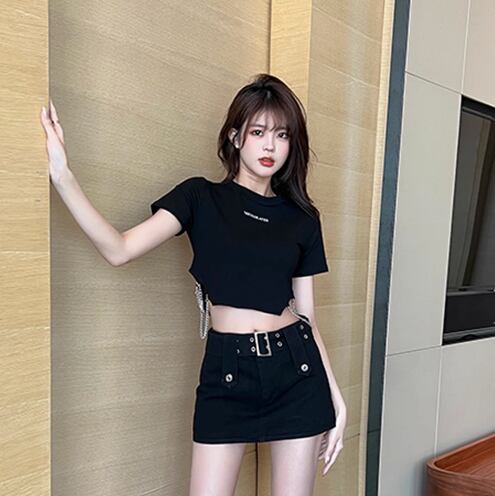 トップス カットソー ミニ丈 半袖 クルーネック レディース 襟なし タイト スリム アシンメトリー ストリート シンプル カジュアル おしゃれ かっこいい こなれ感 ラフ 個性的 クール モード系 主役級 存在感 ゴシック 都会的 ベーシック ワイルド プリント 夏 10代 20代 ティーン デート お出かけ 女子会 休日 ショッピング コンサート ライブ 韓国 オルチャン 普段使い 着回し モテ トレンド 流行 インスタ映え 定番 S M L XL 黒 ブラック ベーシックカラー 大人カラー