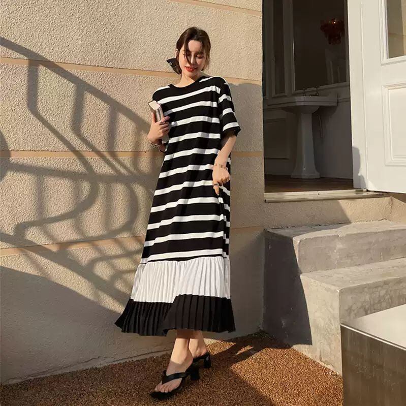 レディース ワンピース ロング 半袖 フェミニン バイカラー かわいい 大人可愛い きれいめ シンプル カジュアル 上品 おしゃれ ガーリー エレガント ラブリー キュート ロマンティック ボーダー 春 夏 お出かけ ショッピング 体型カバー プチプラ 普段使い 着回し トレンド 流行 インスタ映え 定番 L XL 2XL 3XL 黒 ブラック ベーシックカラー 大人カラー 春カラー 秋カラー