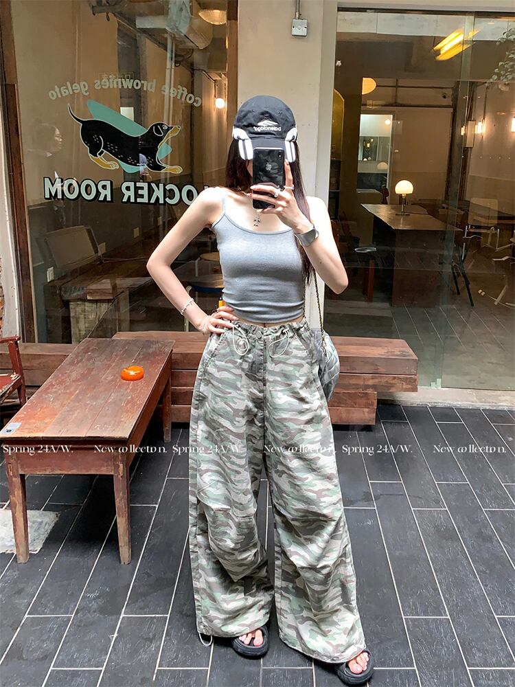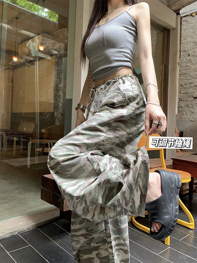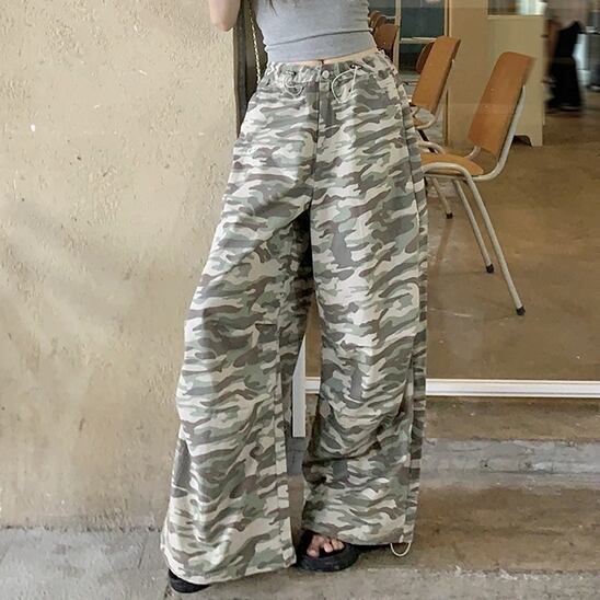 流行のワイドシルエットが魅力のレディースパンツ。ストリートコーデにも合わせやすいシンプルなデザインで、おしゃれに決めたい方にぴったりです。フルレングスで脚長効果も抜群!カモフラージュ柄がオシャレなアクセントになっています。