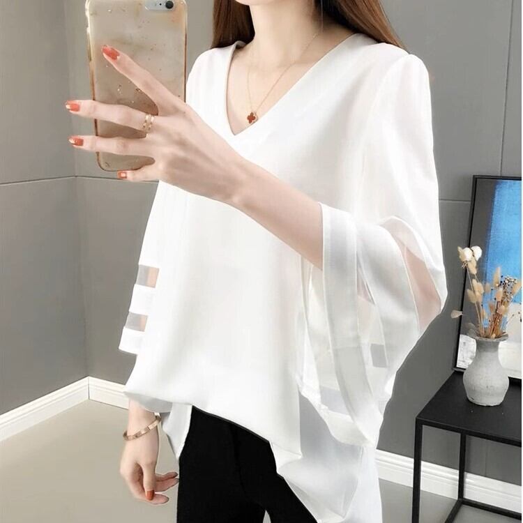 レディース シャツ ブラウス プルオーバー 7分袖 ボリューム袖 Vネック 襟なし 透け感 シースルー 薄手 きれいめ シンプル 上品 おしゃれ かっこいい エレガント ファッショナブル 無地 春 夏 秋 オフィス OL 通勤 デート お出かけ お泊まり イベント リゾート 旅行 レストラン 女子会 休日 ホテル ガーデン 合コン コンパ 重ね着 楽ちん プレゼント 体型カバー 普段使い 着回し L XL 2XL 3XL ゆったり ゆる 白 ホワイト 黒 ブラック ネイビー 紺