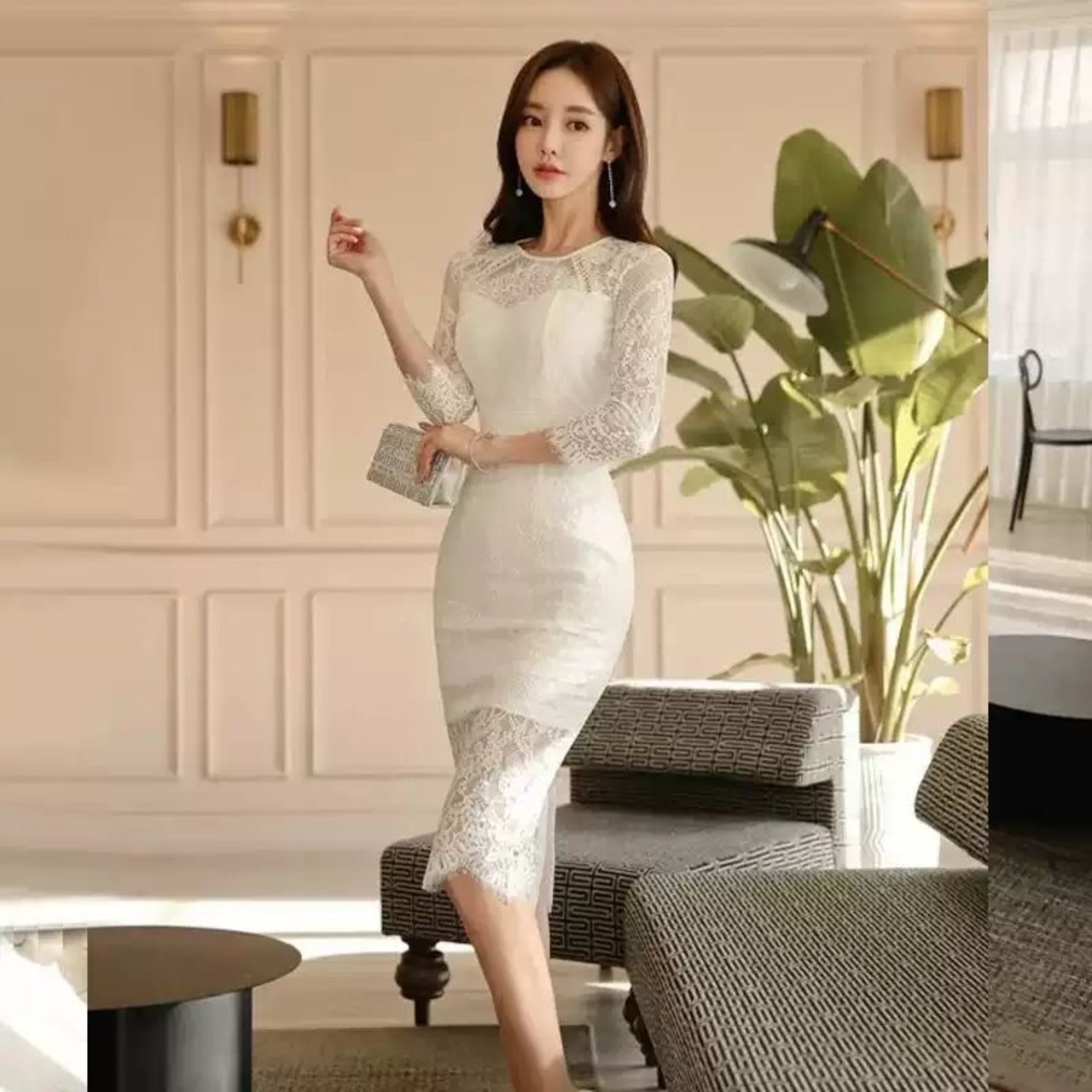 レディース ワンピース 膝下 7分袖 ラウンドネック タイト フェミニン レース かわいい 大人可愛い きれいめ 上品 おしゃれ エレガント ラブリー キュート ロマンティック オールシーズン お出かけ ショッピング 美脚 脚長 プチプラ 普段使い 着回し トレンド 流行 インスタ映え 定番 S M L XL 白 ホワイト ベーシックカラー 大人カラー 春カラー 秋カラー