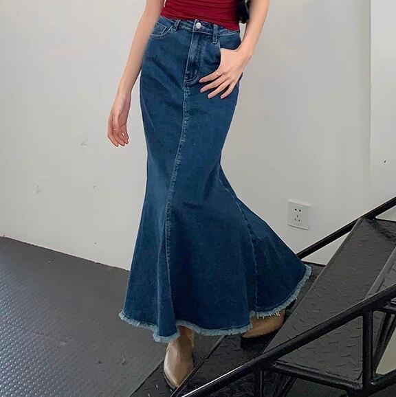 フェミニンなマーメイドシルエットが魅力のデニムスカートでどんなシーンもスタイリッシュに演出!