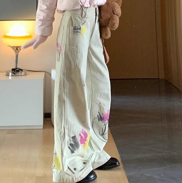 レディース パンツ ボトムス デニム ストレートパンツ ロングパンツ デニムパンツ フルレングス アシンメトリー ストリート ポケット ハイウエスト ヴィンテージ ダメージ かわいい カジュアル おしゃれ レトロ こなれ感 ラフ ルーズ 個性的 クール ラブリー キュート アクティブ ペイント柄 オールシーズン ロングシーズン シーズンレス 10代 20代 ティーン 学生 お出かけ イベント 休日 ライブ フェス 体型カバー 美脚 脚長 着回し トレンド 流行 インスタ映え S M L XL アイボリー