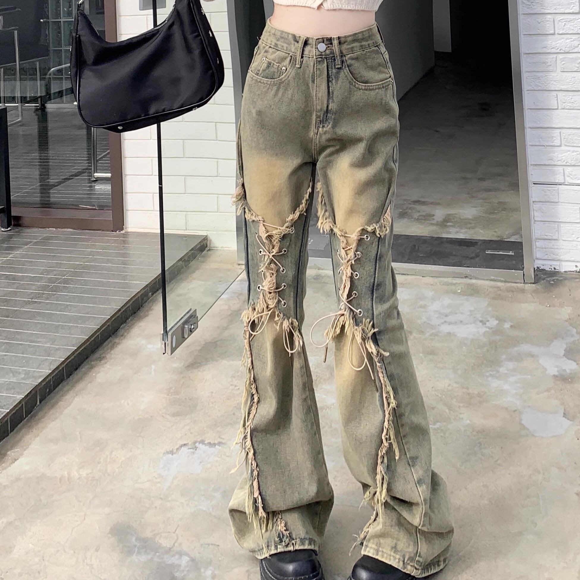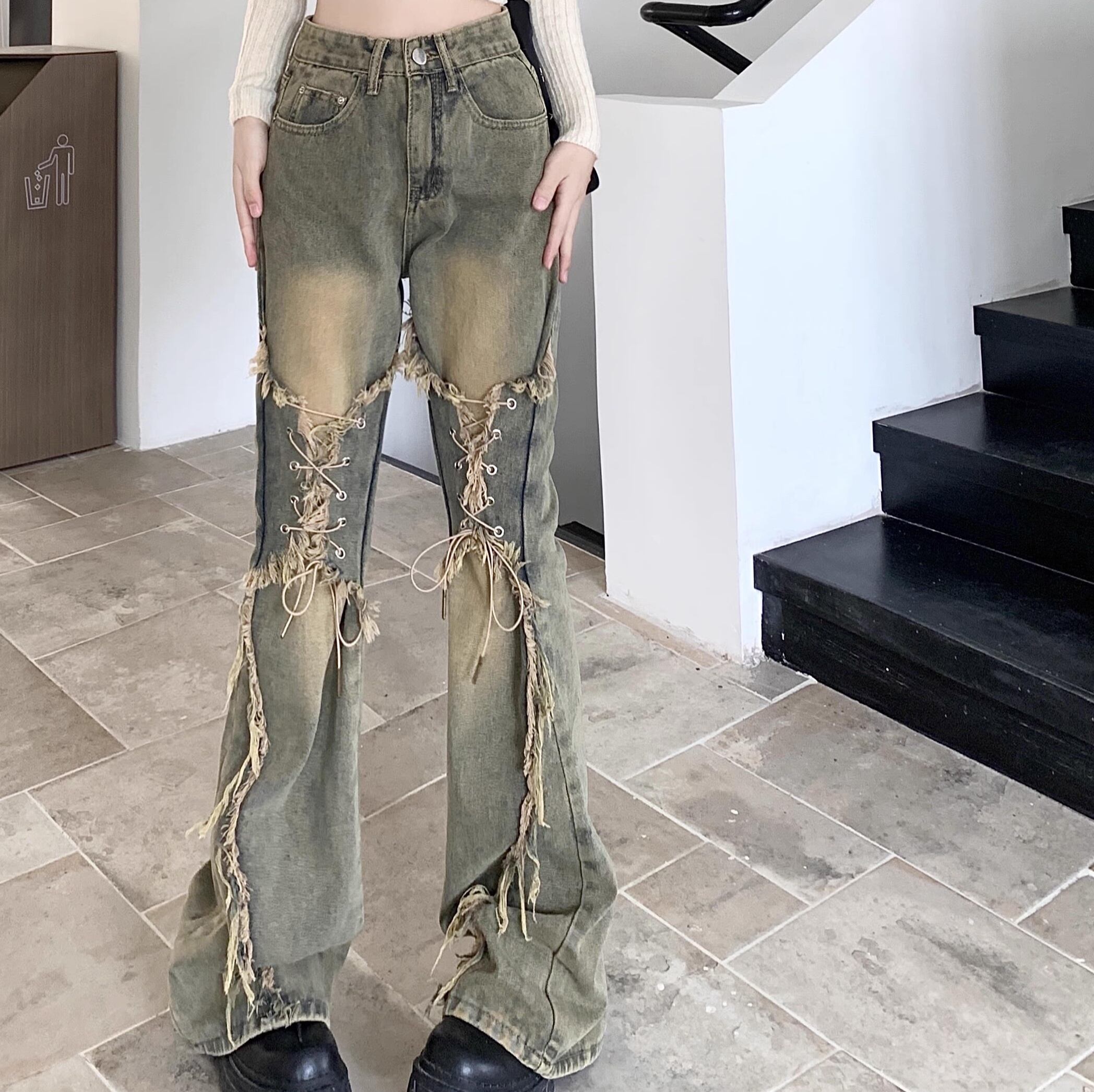 ハイウエストと編み上げデザインが美脚&脚長効果を引き出し、ダメージとウォッシュ加工でワイルドな雰囲気を演出。