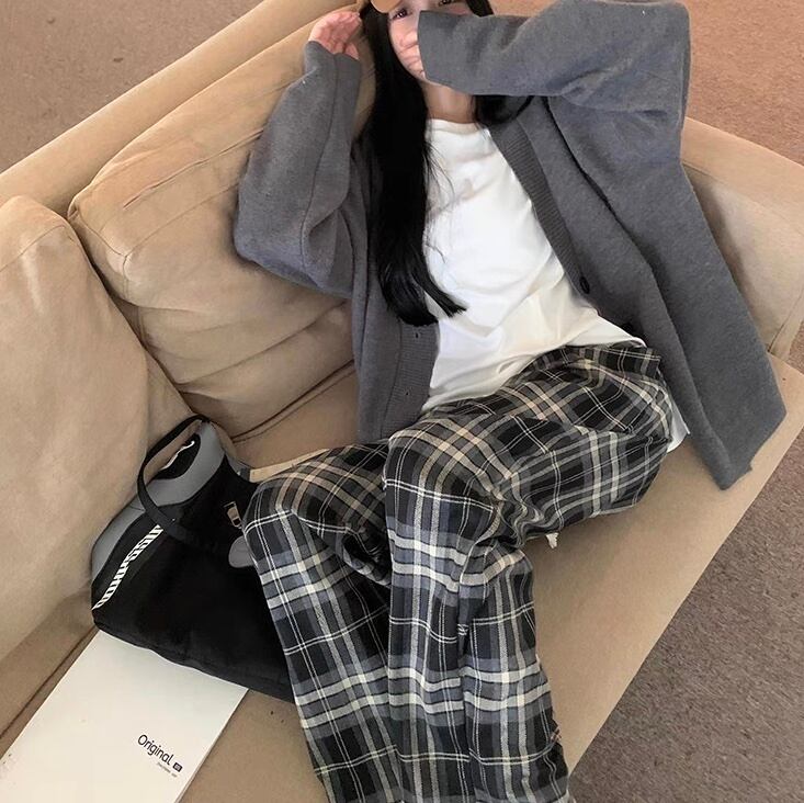 ヴィンテージ風のアメカジスタイルが光るレディースカーディガンとパンツの部屋着セット。