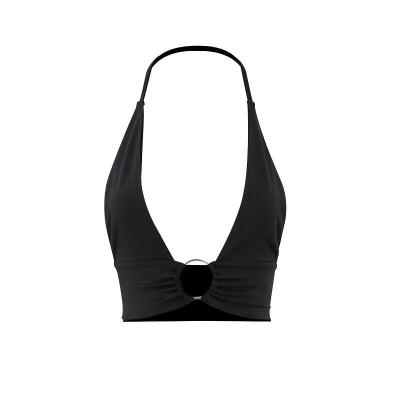 胸元のリングデザインがセクシーで大胆なキャミソールトップスは、女性らしさとクールさを引き立てる一着。