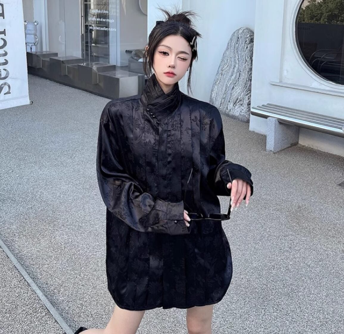シンプルでありながら、華やかな雰囲気を演出する長袖チャイナシャツ風トップス。