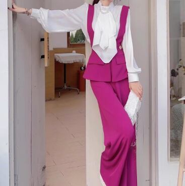上品でエレガントなセットアップは、ボリューム袖とりぼんタイでフェミニンさをプラス。