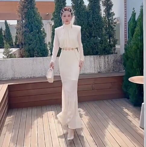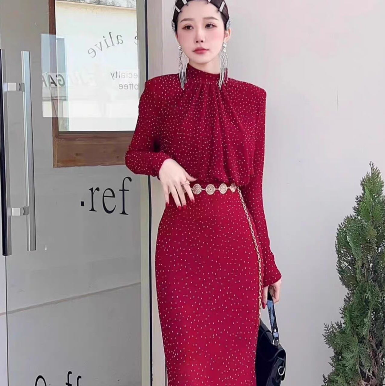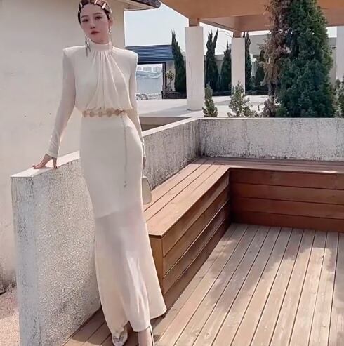 パフスリーブとスタンドカラーがクラシカルな雰囲気を演出し、タックプリーツとウエストマークで美しいボディラインを引き立てます。