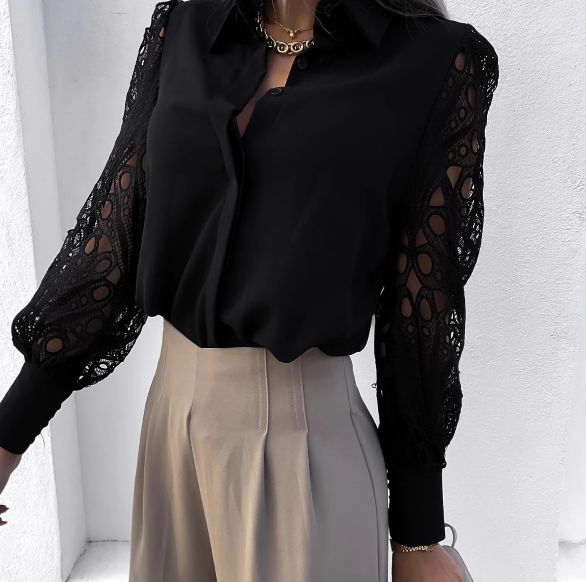 袖がレースになった上品なシャツが登場しました。