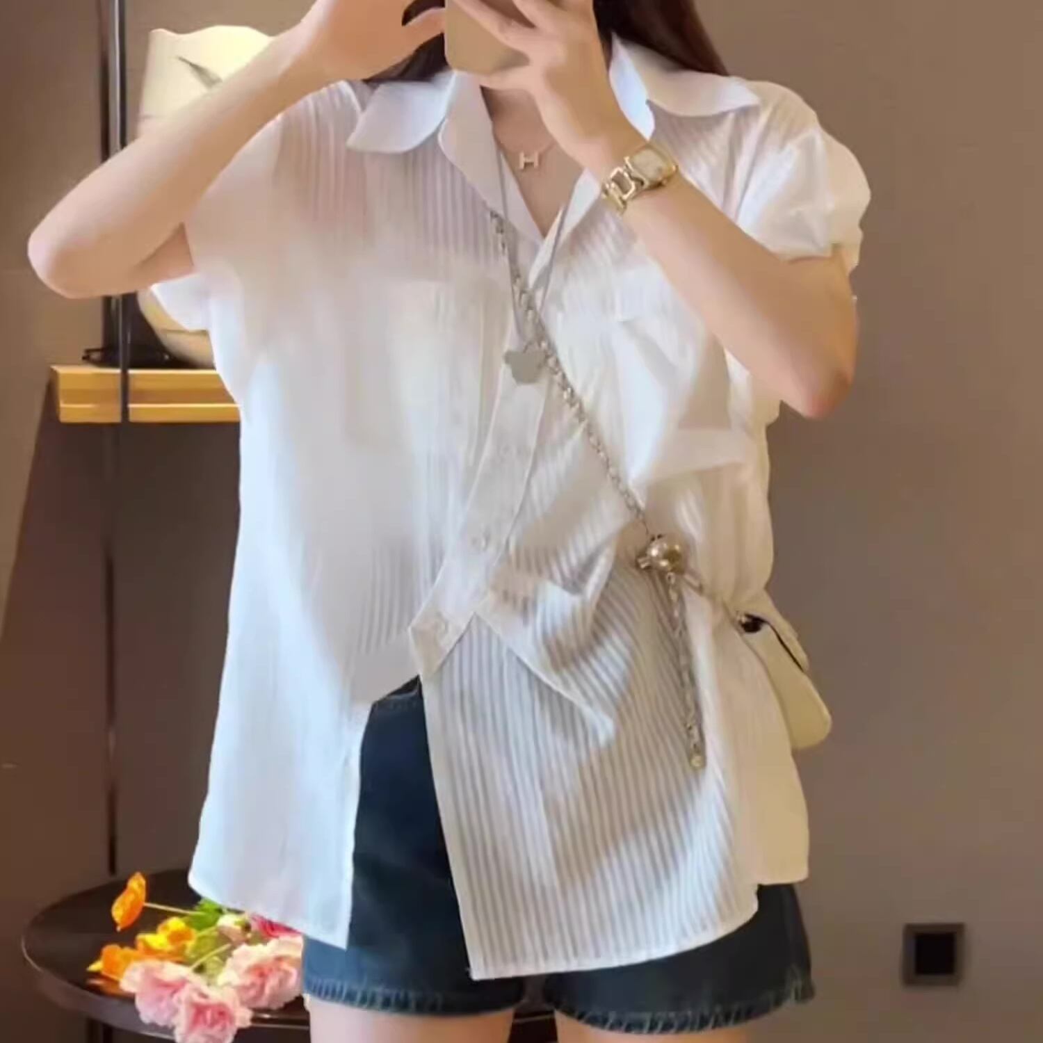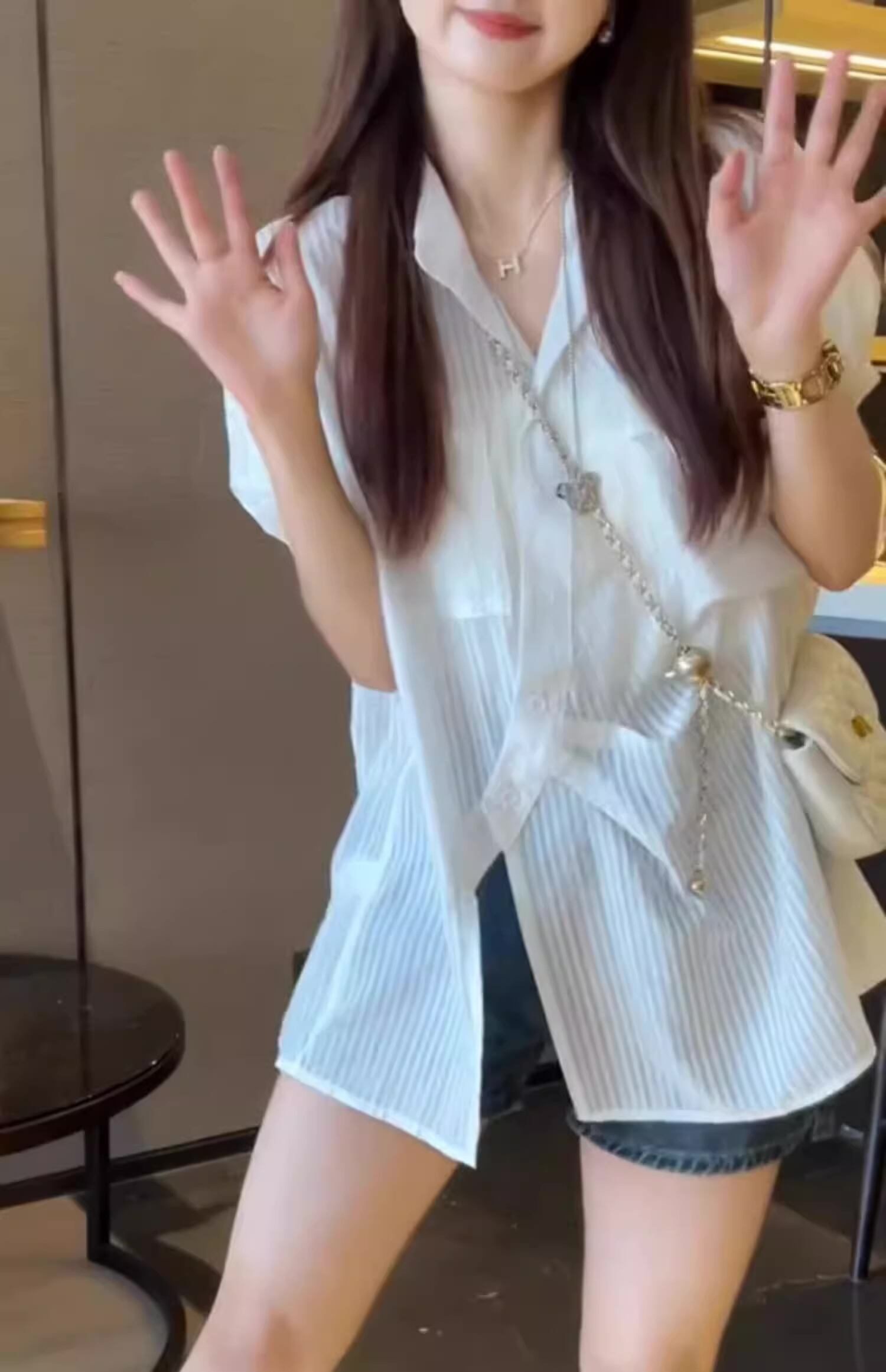 レディース トップス シャツ ブラウス ロング 半袖 Vネック 襟付き ワイド ストレート Iライン ポケット 前開き 透け感 薄手 大人可愛い きれいめ シンプル カジュアル 上品 おしゃれ こなれ感 ガーリー 個性的 クール 抜け感 アクティブ ナチュラル ストライプ 夏 学生 デート お出かけ イベント リゾート 旅行 レストラン 公園 女子会 休日 バカンス ホテル ガーデン ショッピング 発表会 コンサート ライブ 体型カバー 普段使い 着回し ゆったり ゆる ホワイト ブルー