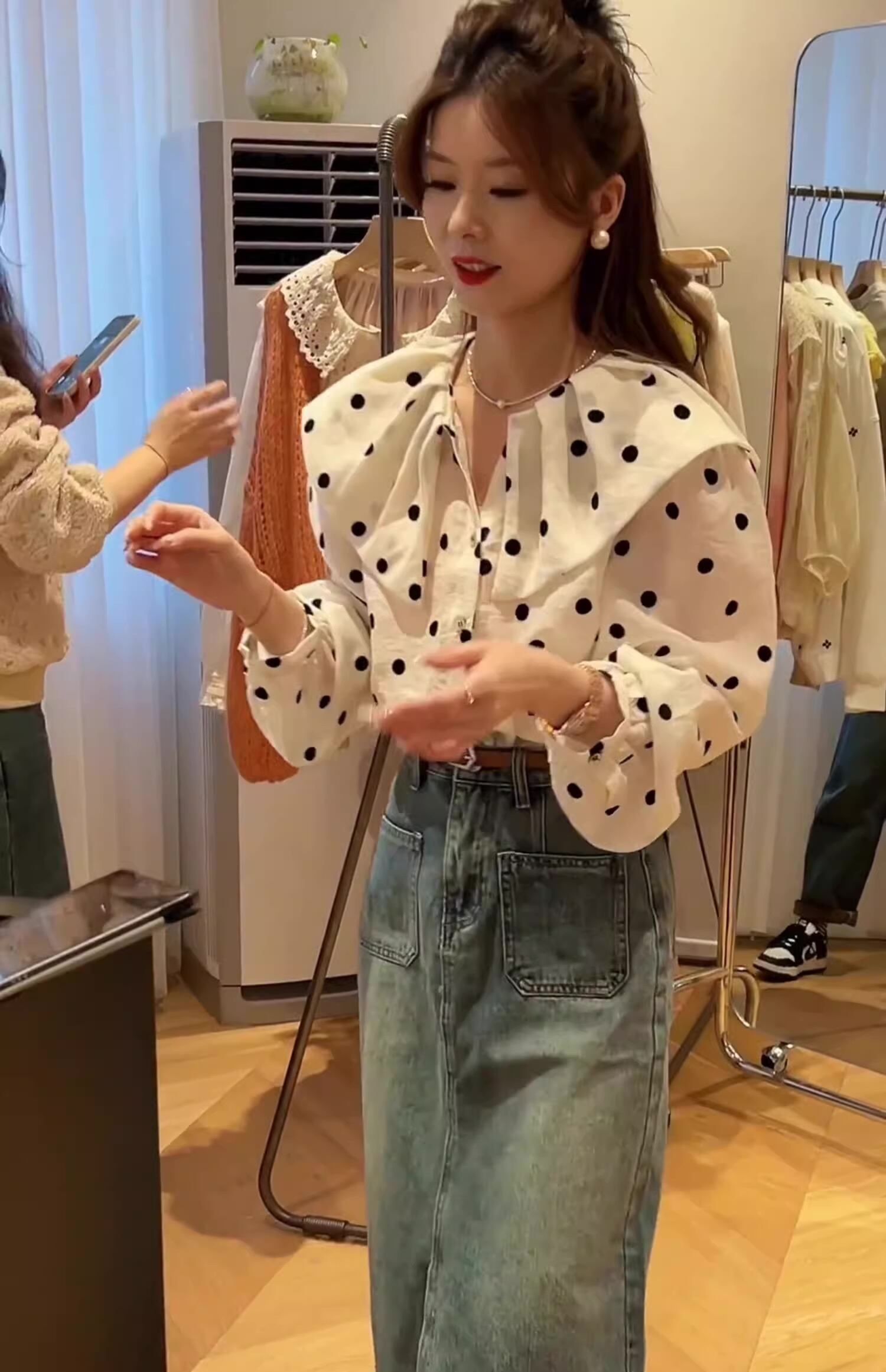 ドット柄に大きなフリルの襟が特徴的なブラウスです。