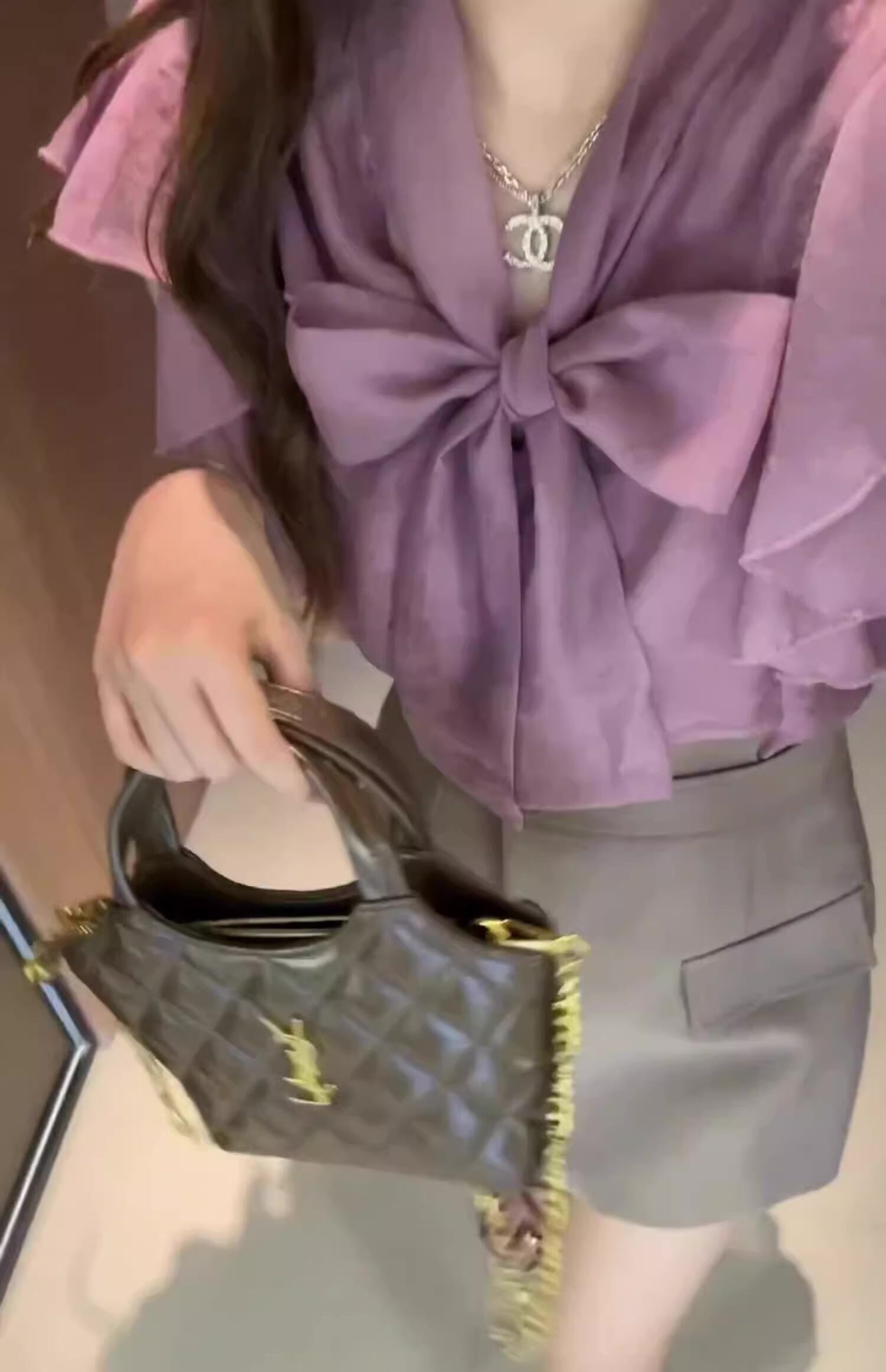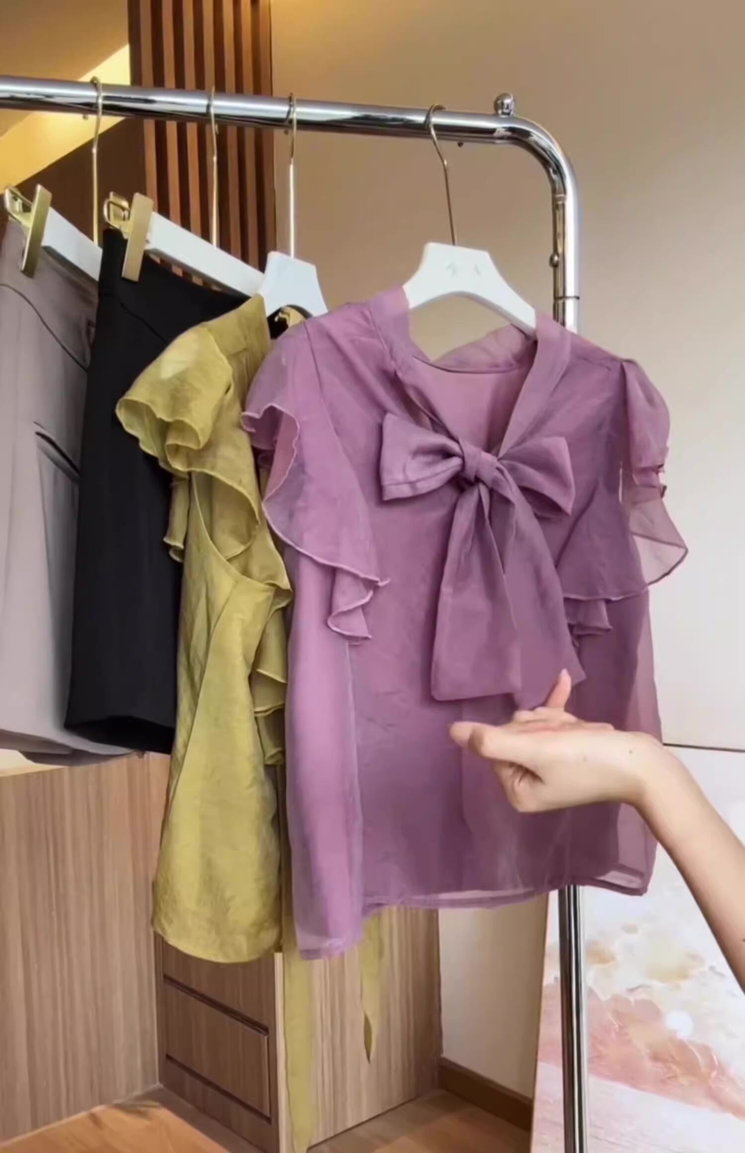 襟元の大きなリボンが特徴的なシフォン素材のブラウスです。
