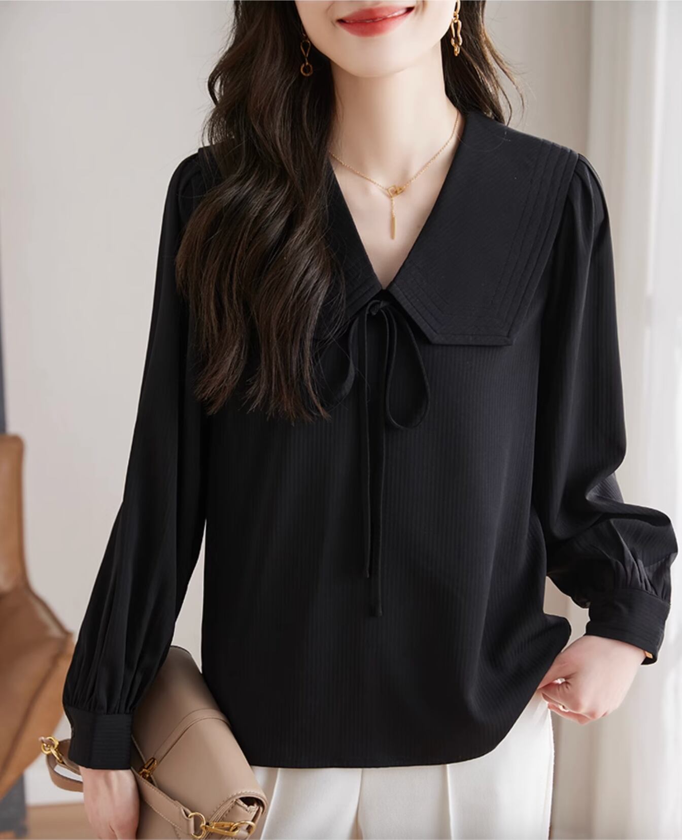 大きな襟とリボンタイが特徴的で上品な雰囲気の七分丈トップスです。