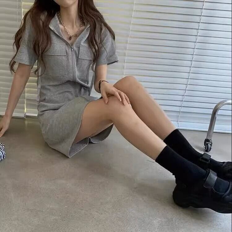 レディース ワンピース ショート 半袖 フード タイト スリム 細身 ストレート ファスナー ポケット 前開き コットン 大人可愛い シンプル 上品 おしゃれ かっこいい ラフ クール 都会的 ファッショナブル 春 夏 オフィス OL 通勤 デート お出かけ イベント レストラン 女子会 休日 高原 ホテル ガーデン ショッピング 合コン コンパ 韓国 オルチャン コーデ プレゼント 脚長 普段使い 着回し モテ S M L XL 白 ホワイト 黒 ブラック グレー 灰色