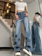 レディース パンツ デニム Gパン フルレングス ワイド ストリート ウォッシュ かわいい 大人可愛い カジュアル おしゃれ かっこいい ボーイッシュ ラブリー キュート アメリカン 星柄 オールシーズン お出かけ ショッピング コーデ 体型カバー 美脚 脚長 普段使い 着回し トレンド 流行 インスタ映え 定番 S M L XL ブルー ベーシックカラー 大人カラー 春カラー 秋カラー