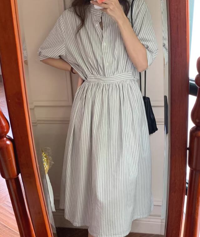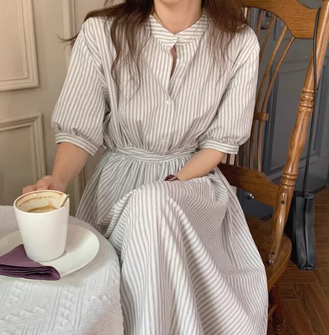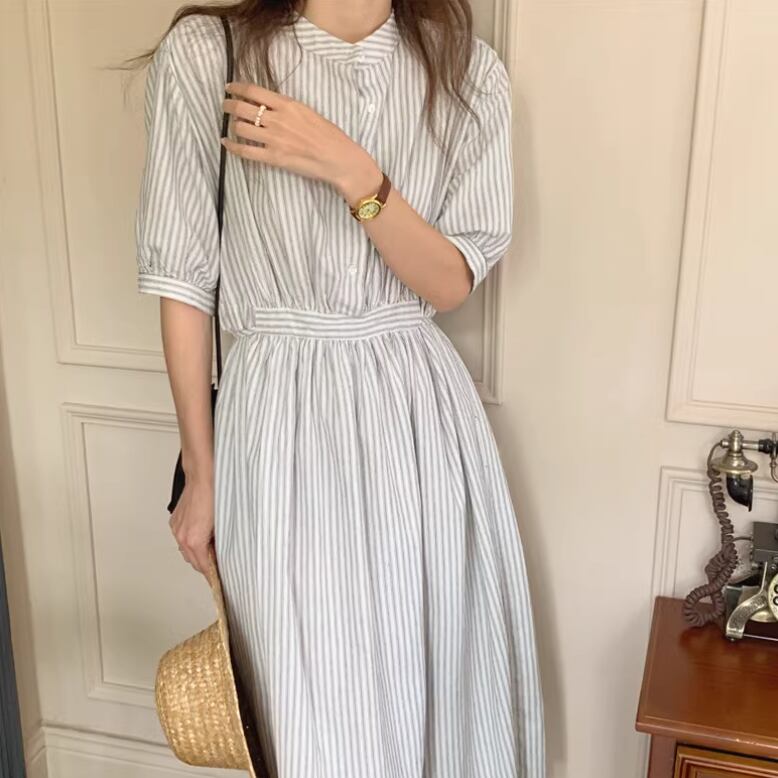 レディース ワンピース フレア ロング丈 7分袖 パフスリーブ 袖あり 襟なし スタンドカラー ハイウエスト 前開き ボタン かわいい 大人可愛い シンプル カジュアル おしゃれ レトロ アジアン こなれ感 ラフ ナチュラル ストライプ 柄 夏 秋 20代 30代 お姉さん デート お出かけ リゾート 旅行 海 レストラン ビーチ 公園 女子会 休日 バカンス ショッピング カフェ フェス コーデ 楽ちん 美脚 脚長 普段使い 定番 フリーサイズ ライトグレー 大人カラー 秋カラー