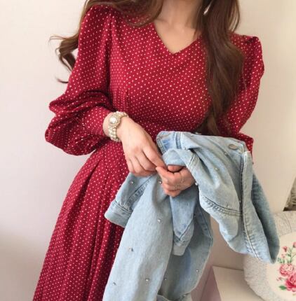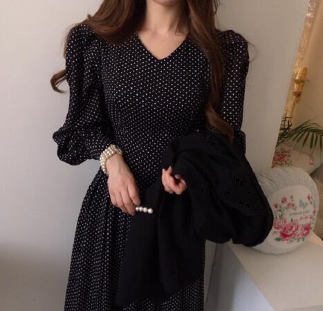 レディース スカート ワンピース ロングスカート 膝下 ロング 長袖 ボリューム袖 ランタンスリーブ Vネック フレア Aライン フェミニン プリーツ シフォン ハイウエスト レースアップ 大人可愛い きれいめ 上品 おしゃれ レトロ アジアン こなれ感 ガーリー クラシカル ナチュラル ドット柄 水玉 春 夏 秋 OL 学生 デート お出かけ イベント レストラン 女子会 休日 ショッピング 韓国 オルチャン コーデ 体型カバー 着回し モテ S M L 黒 ブラック レッド 大人カラー 秋カラー 赤