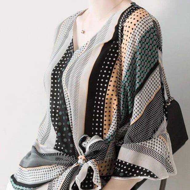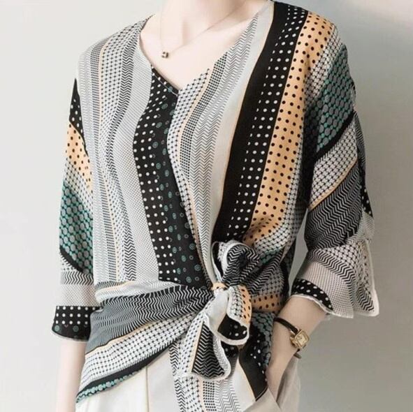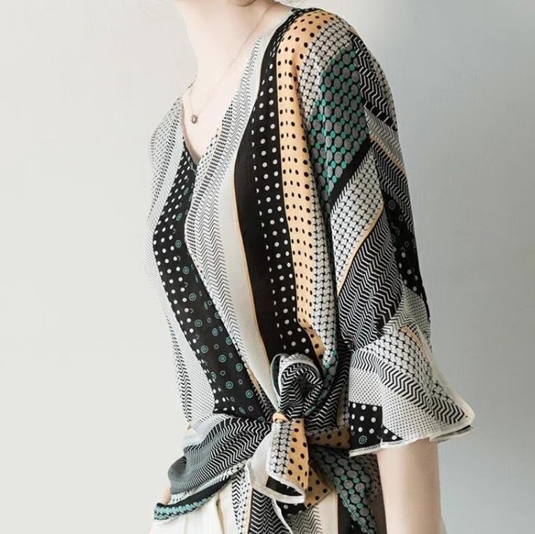 レディース トップス シャツ ブラウス アシンメトリー 5分袖 7分袖 Vネック フェミニン ウエストマーク ウエストリボン ハイウエスト きれいめ 上品 おしゃれ かっこいい レトロ こなれ感 クール モード系 エレガント モダン 存在感 抜け感 都会的 クラシカル ドット柄 水玉 ボーダー ストライプ 総柄 春 夏 30代 40代 アラサー アラフォー イベント 旅行 レストラン 休日 カフェ 着回し トレンド 流行 インスタ映え S M L XL 2XL 小さいサイズ 大きいサイズ 黒 ブラック