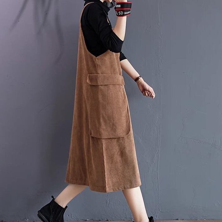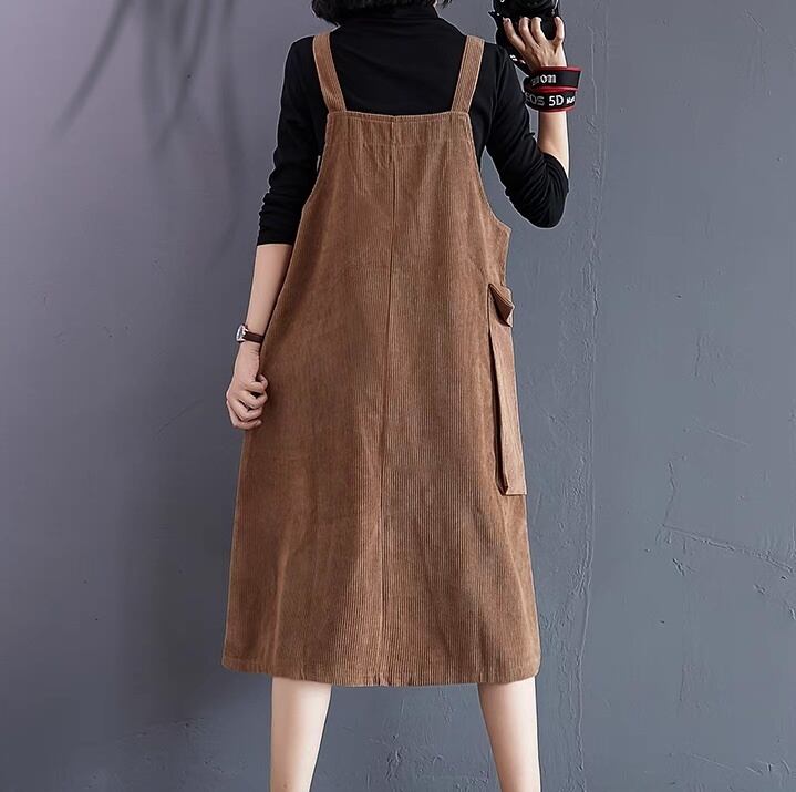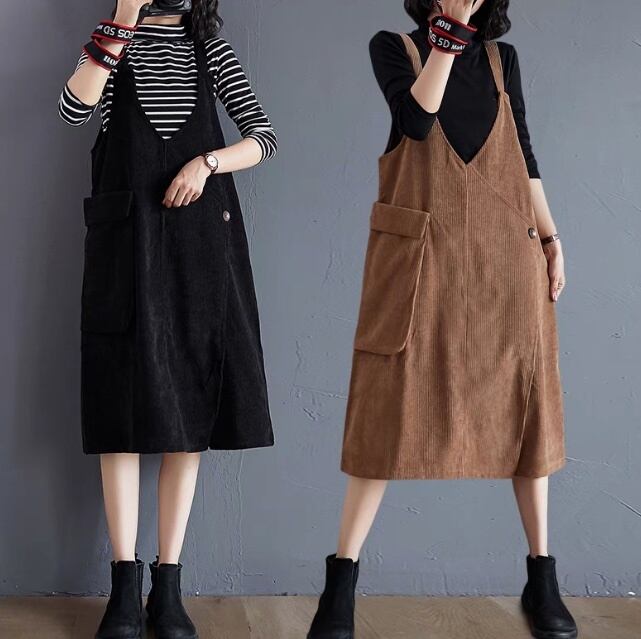 レディース ワンピース フレア ジャンパースカート 膝丈 膝下 袖なし ノースリーブ Vネック オーバーサイズ フェミニン ストリート ポケット ハイウエスト コーデュロイ かわいい 大人可愛い シンプル カジュアル おしゃれ レトロ ベーシック プレッピー カントリー アクティブ ナチュラル ファッショナブル 無地 秋 冬 お出かけ 旅行 女子会 重ね着 体型カバー 普段使い 着回し レイヤード 定番 M L XL 2XL 3XL 大きいサイズ ビッグ ゆったり ゆる 黒 ブラック 茶色 ブラウン